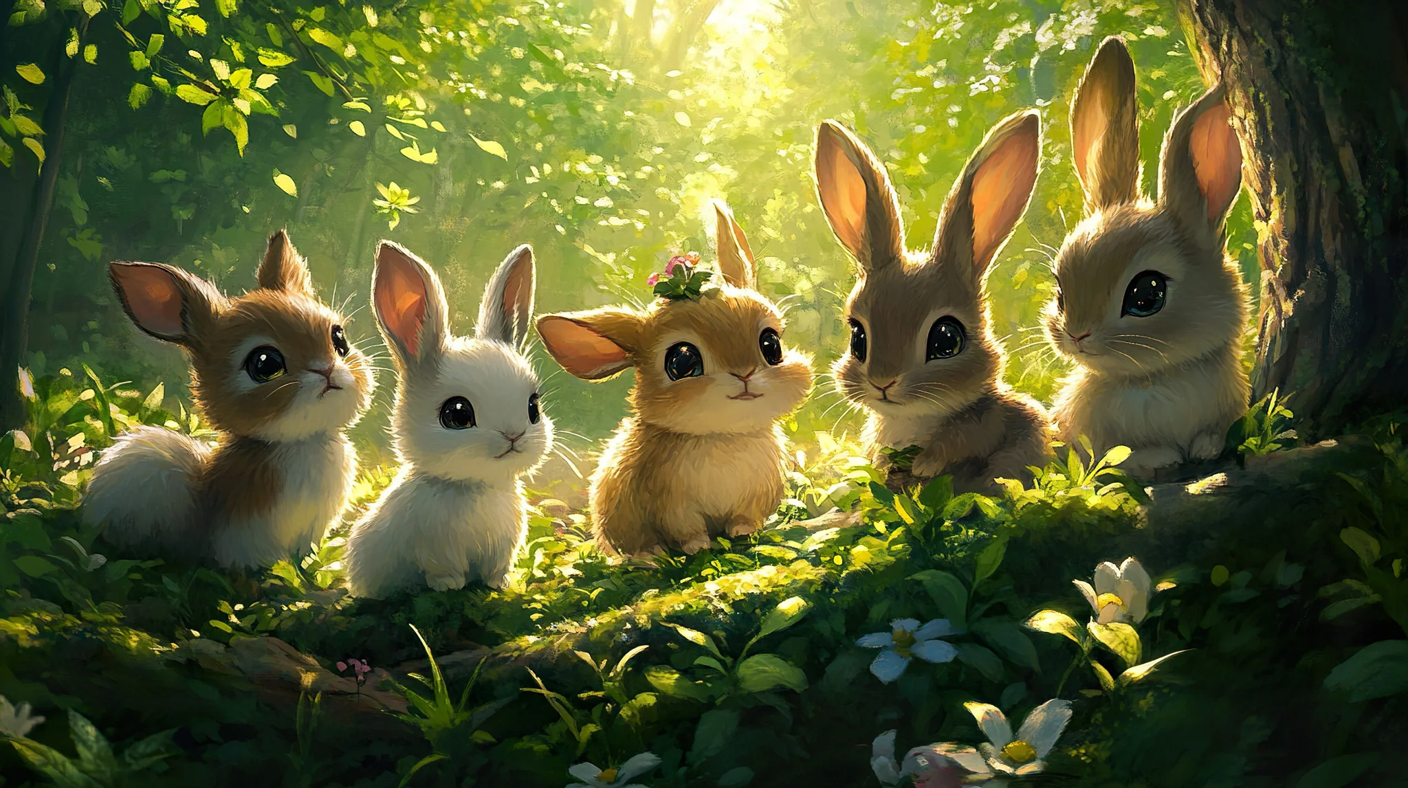 Charming anime animals gather in a sun-dappled forest, creating a delightful and whimsical background.