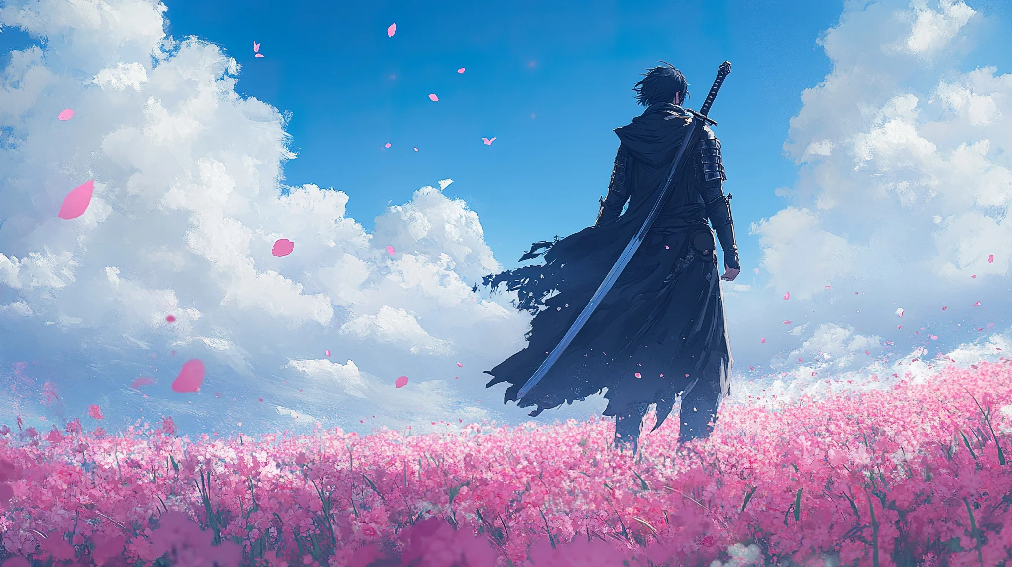 Anime Warrior In A Blossoming Field Background A captivating anime scene featuring a lone warrior with a sword, standing amidst a vibrant field of pink flowers under a vast blue sky.Download ▼