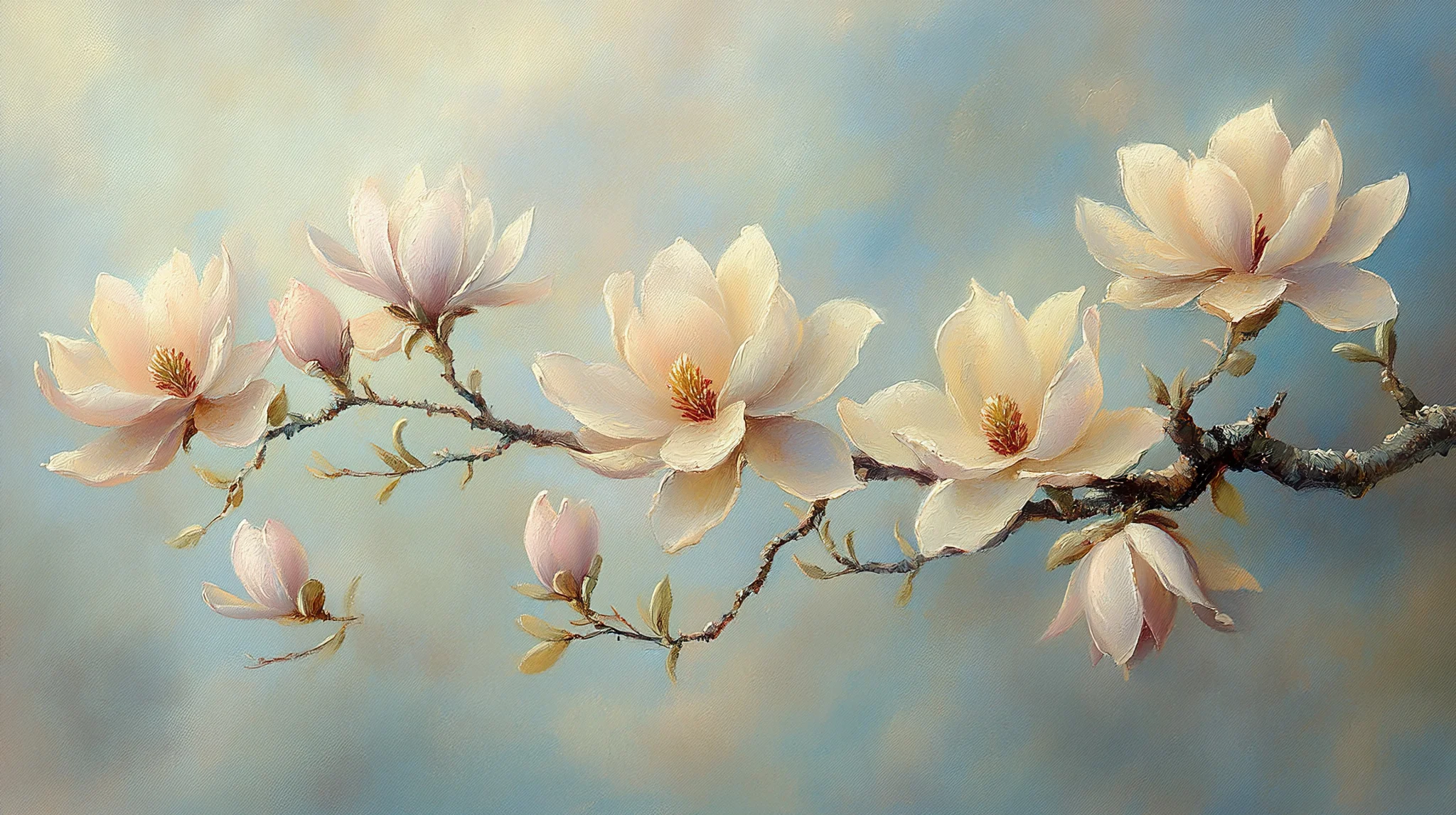 Delicate Magnolia Blossoms On A Serene Branch Wallpaper Experience tranquility with this gentle painting of magnolia blossoms, perfect for a calming background.Download ▼