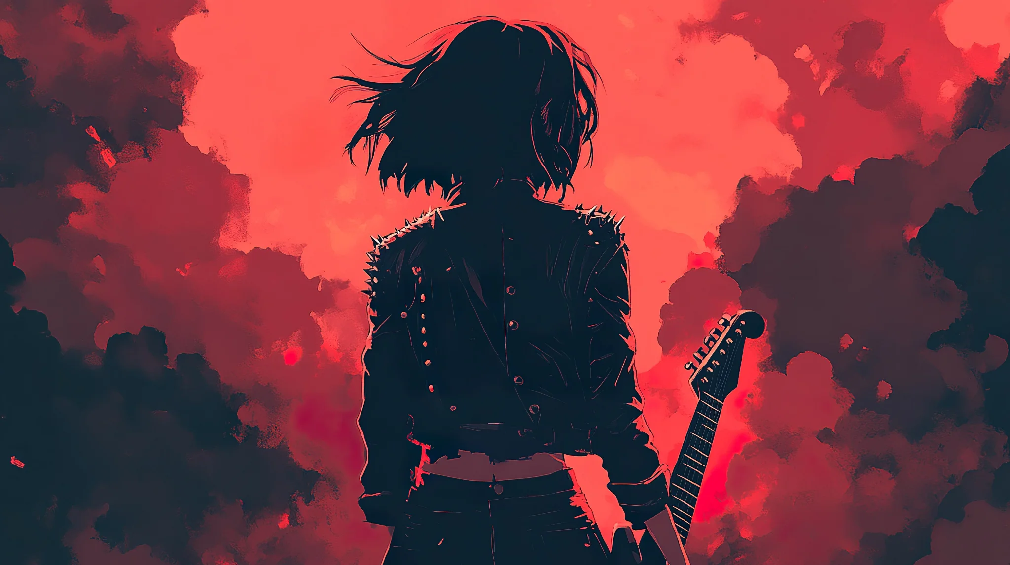 A striking illustration of a girl with short hair and a guitar, set against a dramatic red background. Perfect for a bold and artistic wallpaper.