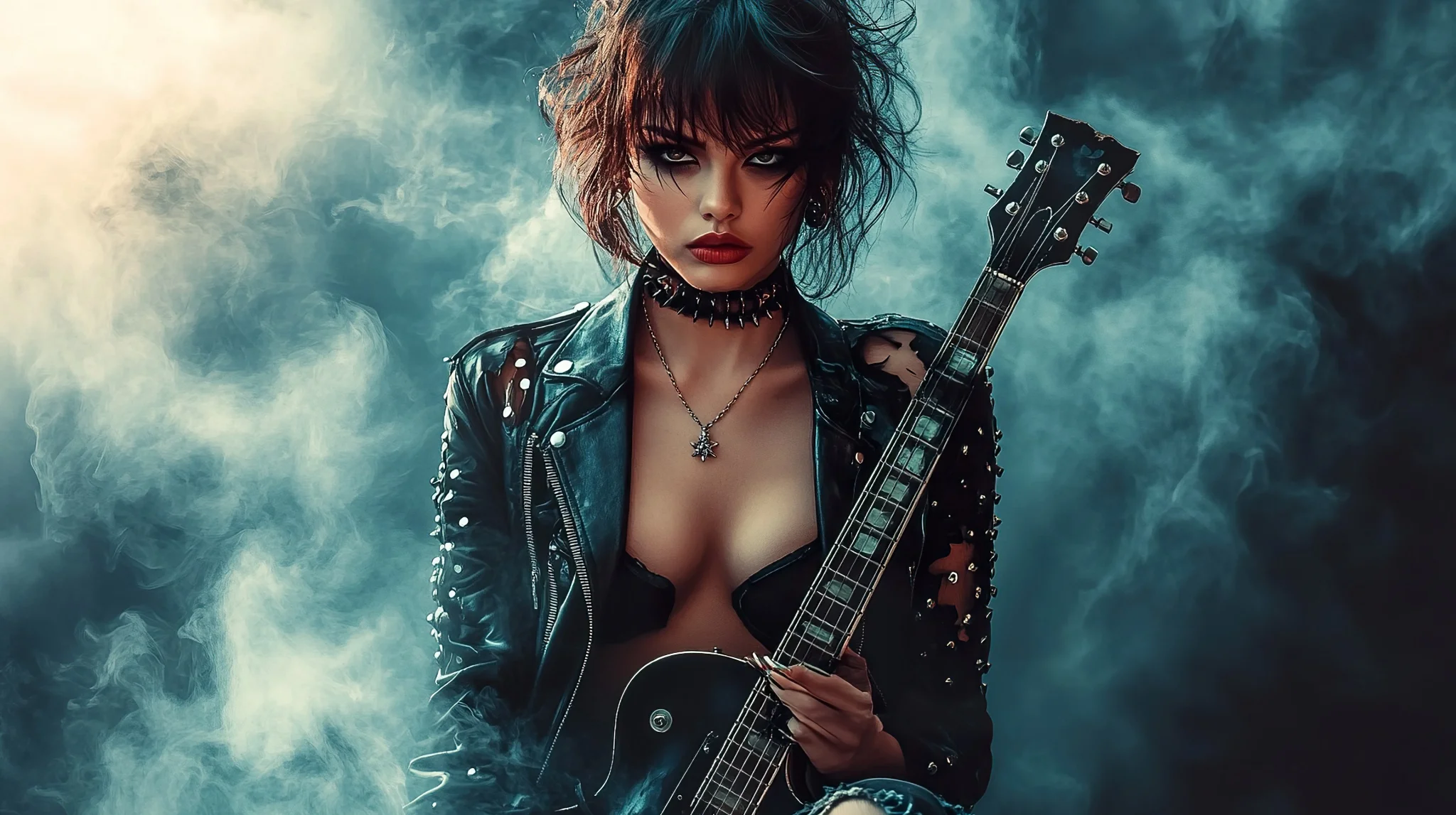 Edgy Rocker Girl With Guitar In Smoky Ambiance Wallpaper Immerse in the edgy vibe of a rocker girl with short hair and a guitar, set against a smoky backdrop. Perfect for a dynamic background.Download ▼ Related Wallpapers