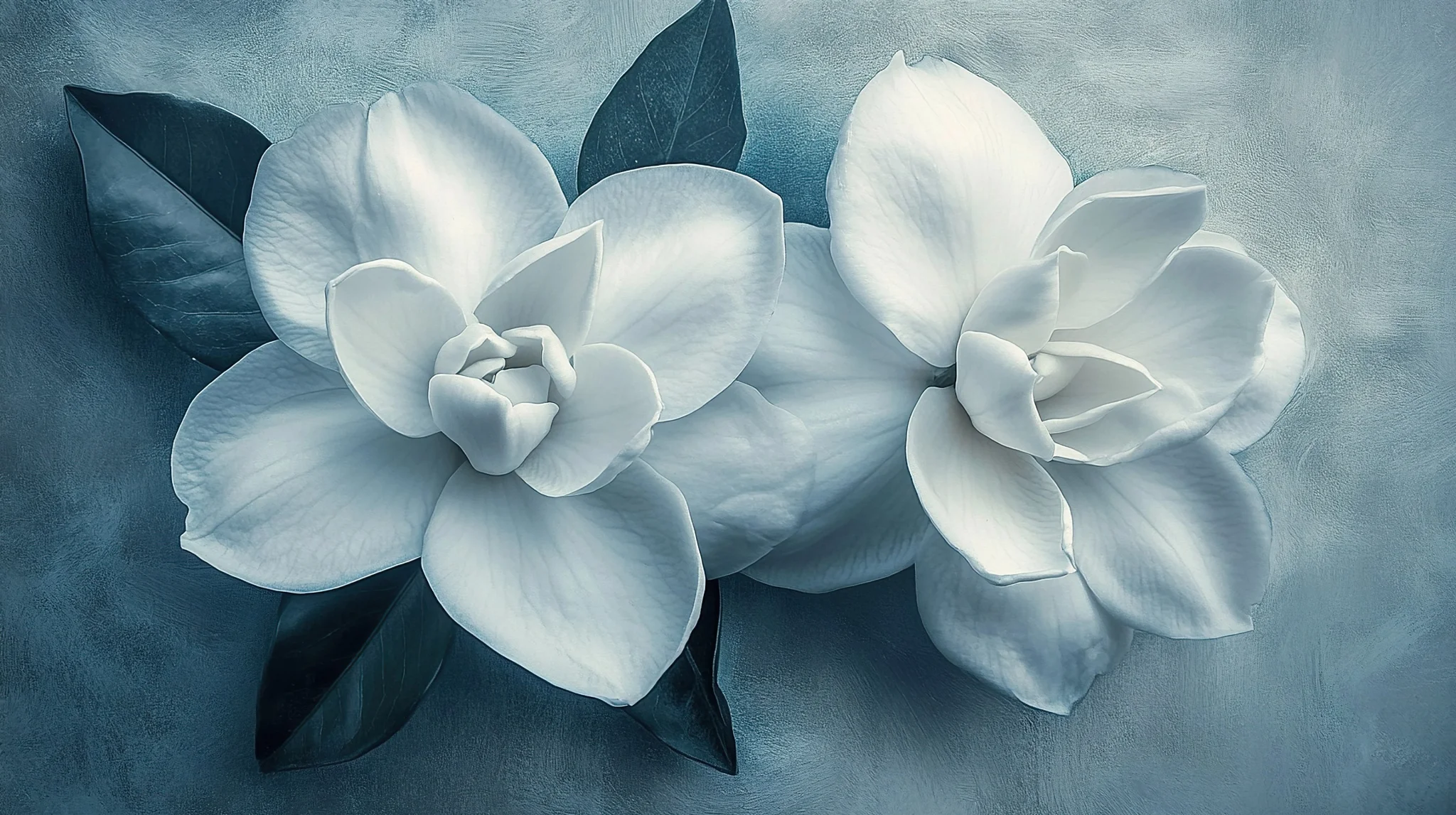 Elegant Gardenias In Soft Blue Tones Wallpaper A serene illustration of gardenias with a soft blue background, perfect for adding a touch of elegance to any digital space.Download ▼