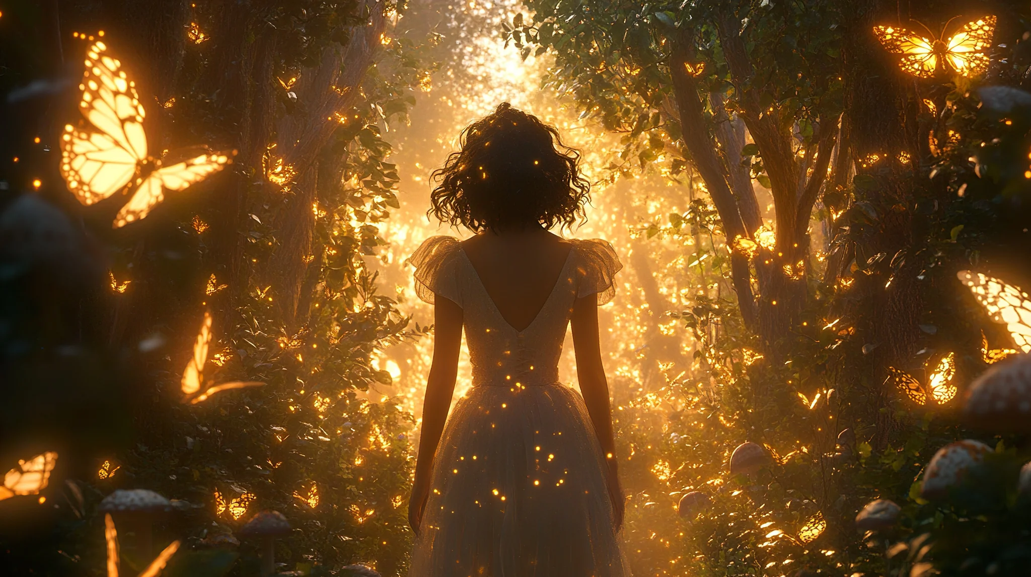 Enchanted Forest Path With Glowing Butterflies Wallpaper A mesmerizing scene of a girl in a magical forest surrounded by glowing butterflies, perfect for a captivating background.Download ▼ Related Wallpapers