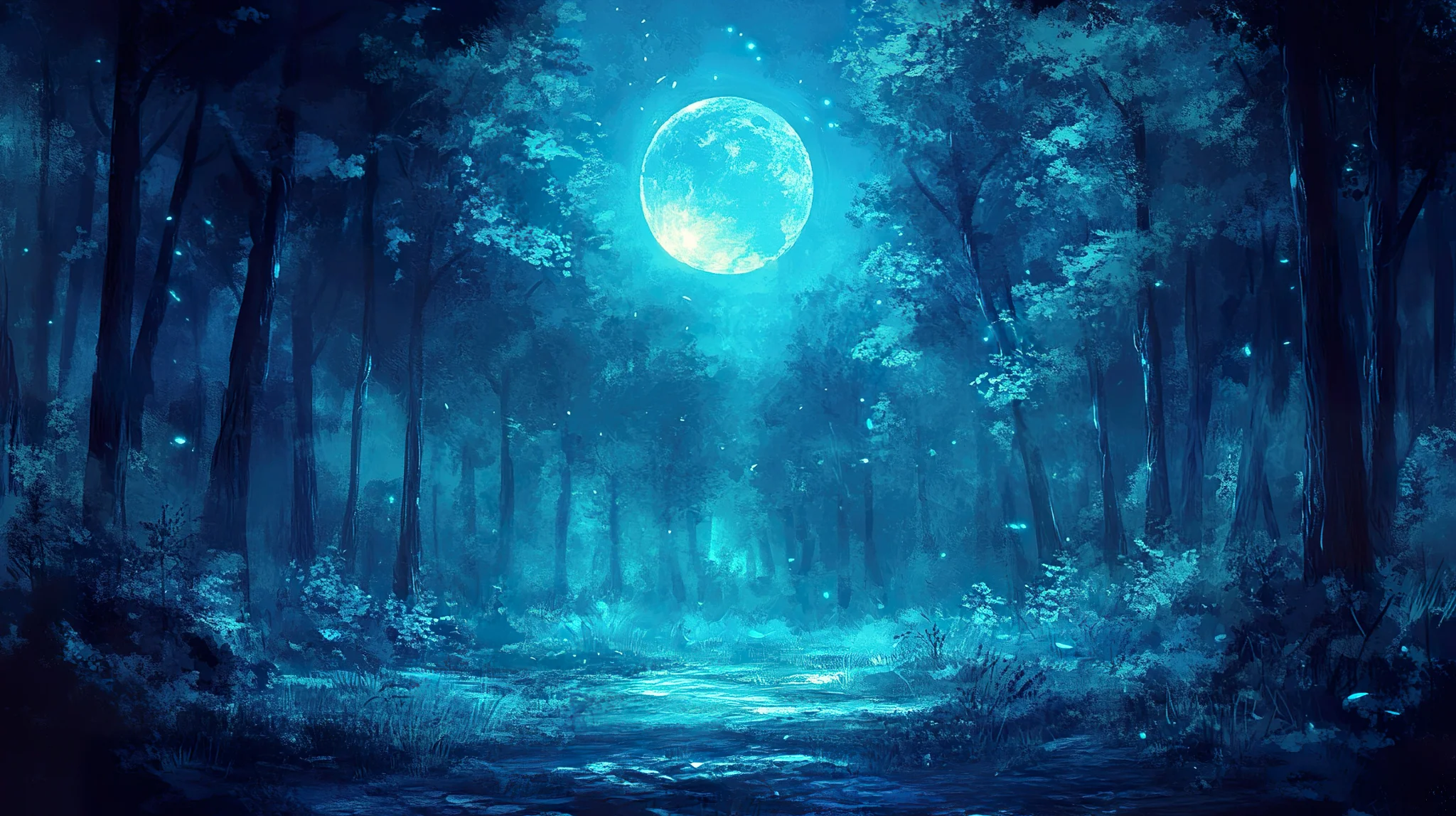 A forest clearing under a full moon with glowing blue hues.