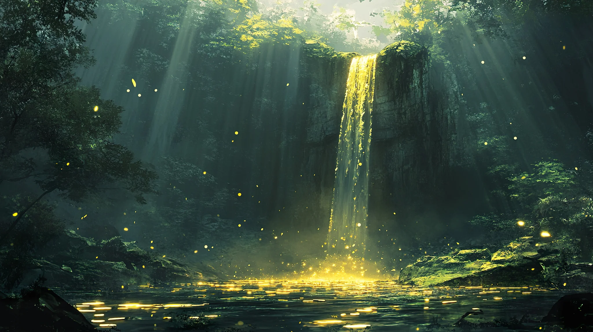Illustration of a glowing waterfall in a lush, hidden forest with light rays.
