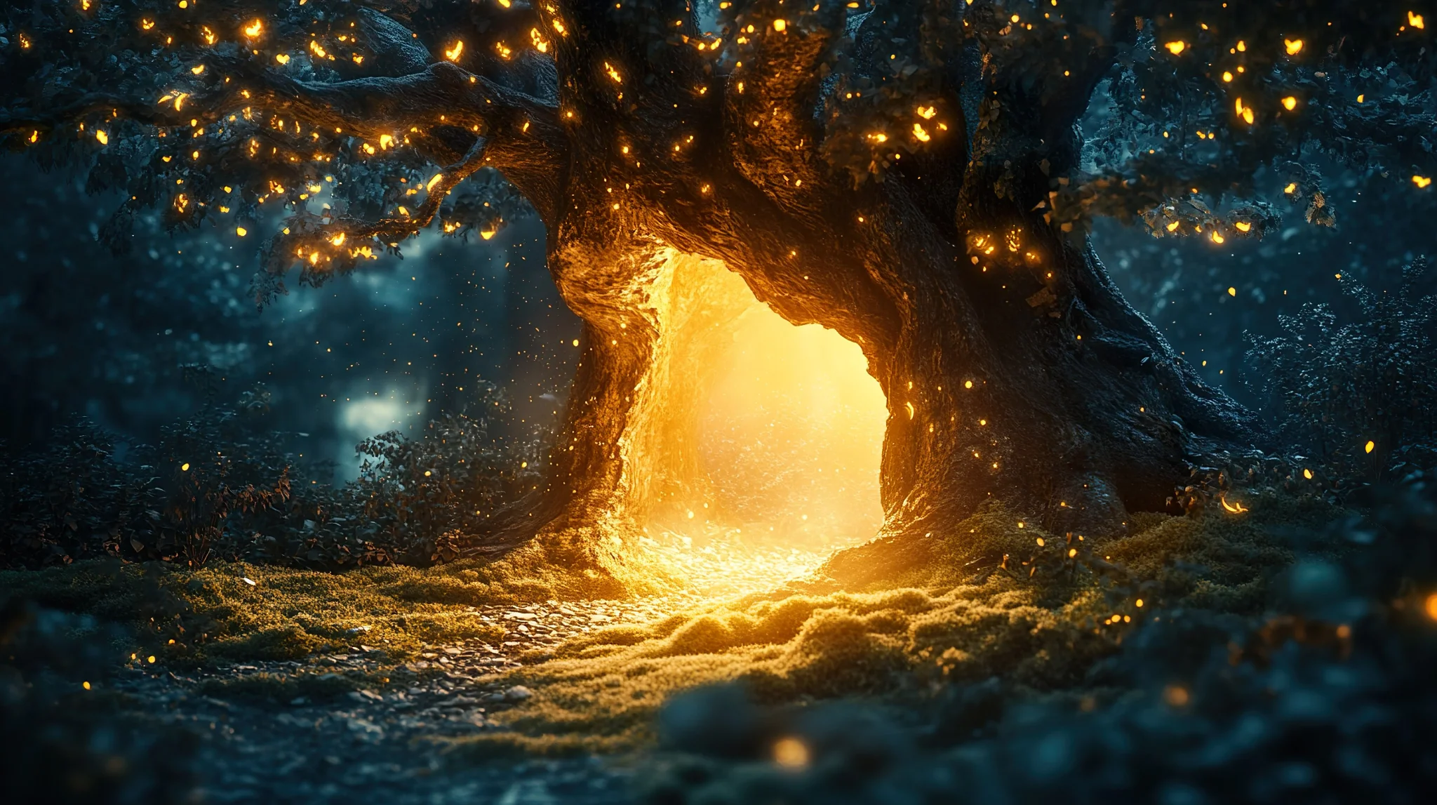 Enchanted Hollow Tree Illuminated By Golden Light Wallpaper A mystical hollow tree glows with golden light, creating a magical forest ambiance. Perfect for a captivating background.Download ▼ Related Wallpapers