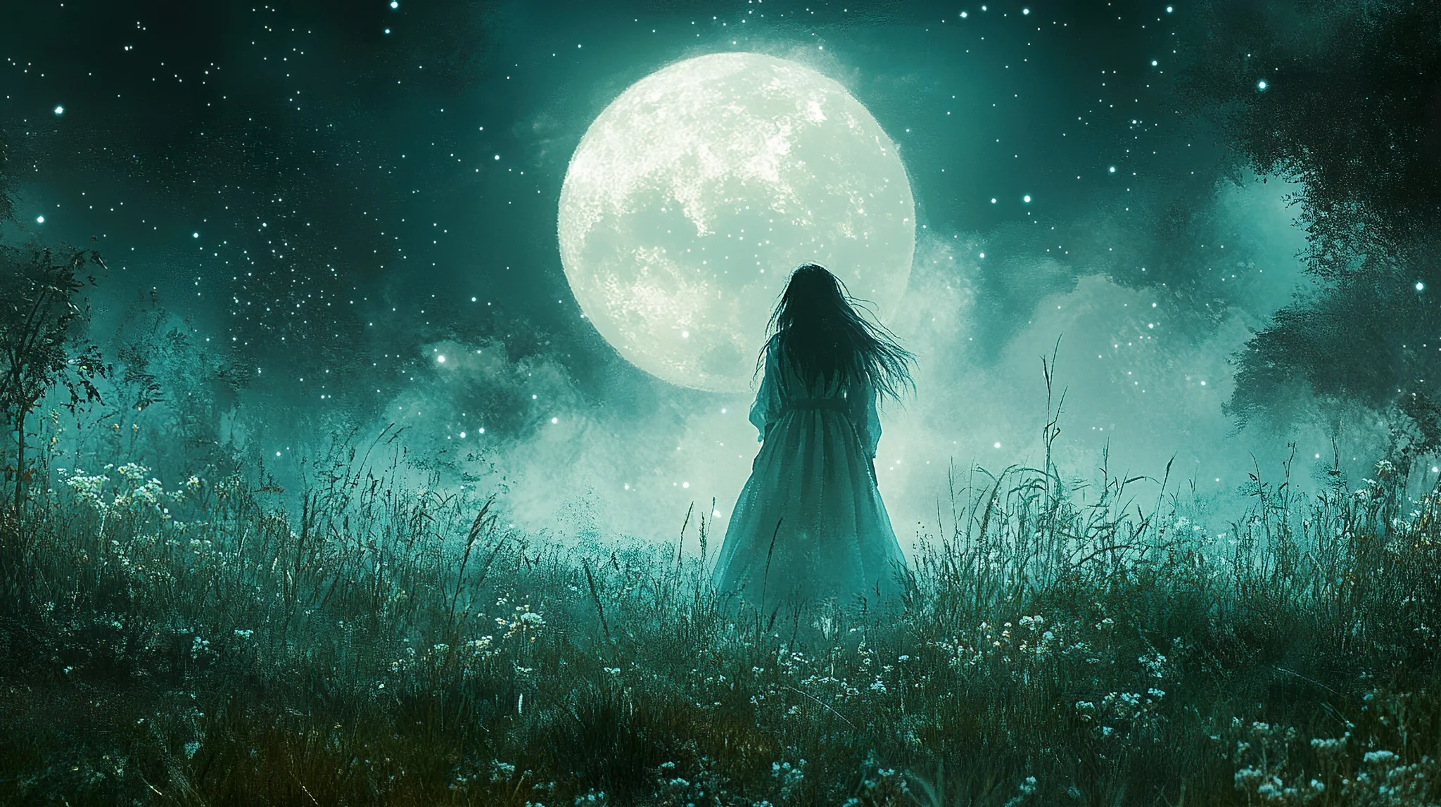 A mesmerizing scene of a girl in a velvet dress gazing at a luminous full moon, perfect for a captivating background.