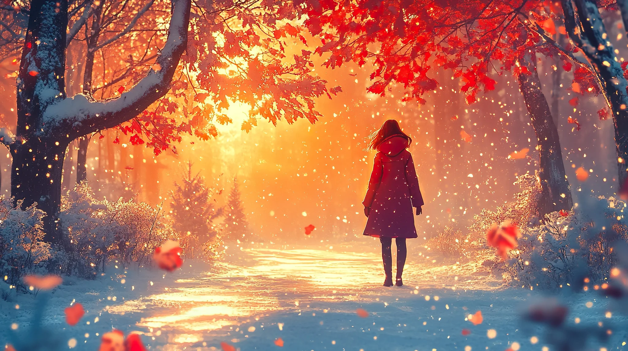 Enchanting Autumn Forest With Snowfall Wallpaper A mesmerizing scene of a forest in autumn, with vibrant leaves and gentle snowfall, creating a magical background.Download ▼