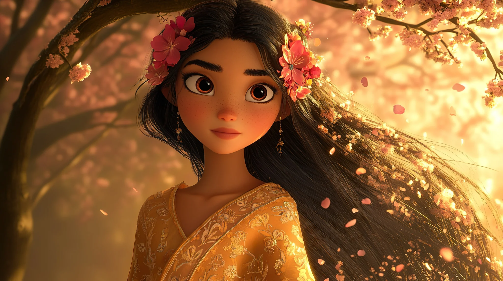 A captivating illustration of a girl with dark hair and floral adornments, set against a dreamy blossom-filled background.