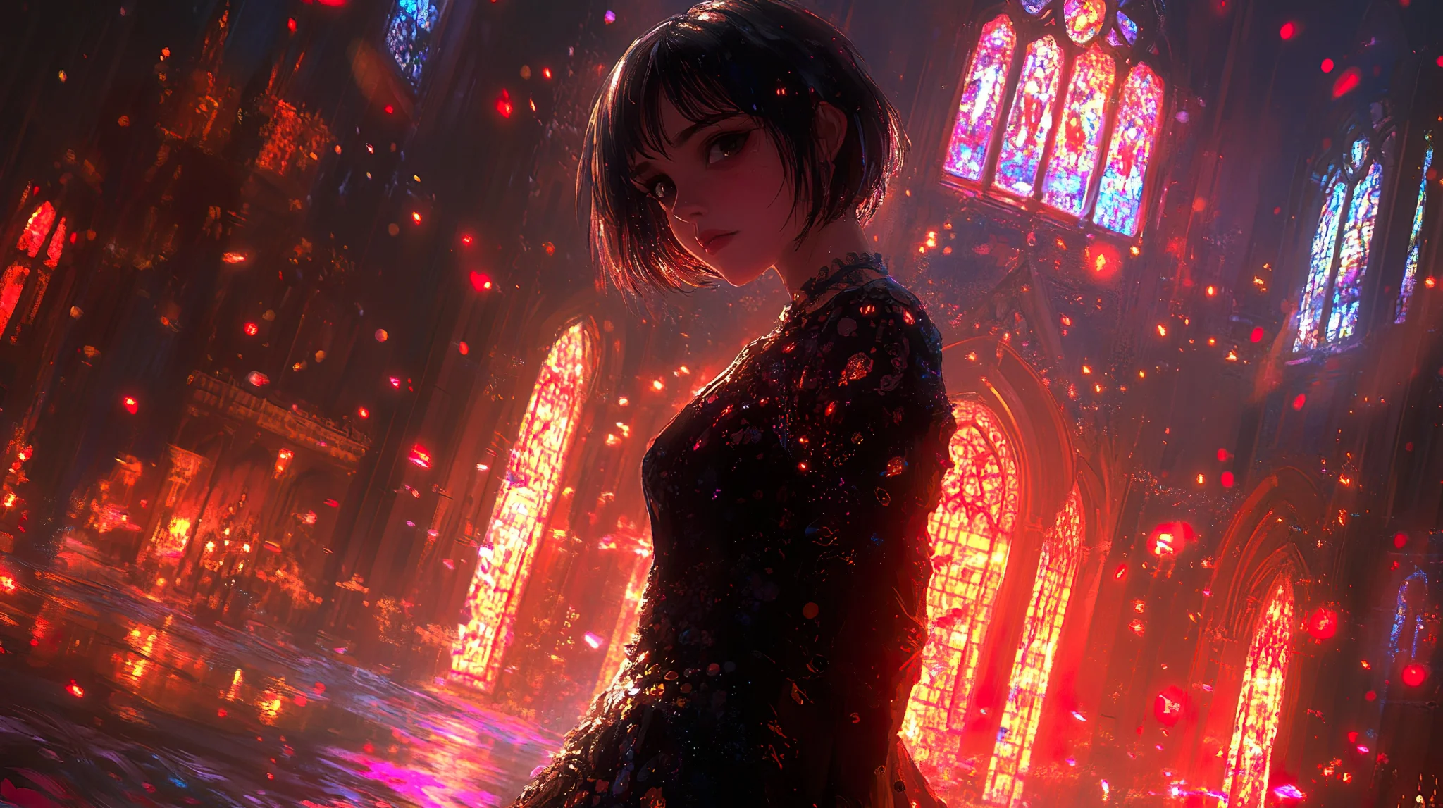 Enigmatic Anime Princess In A Gothic Cathedral Background A captivating anime princess in a detailed black gown stands amidst a glowing cathedral, creating a mesmerizing background.Download ▼