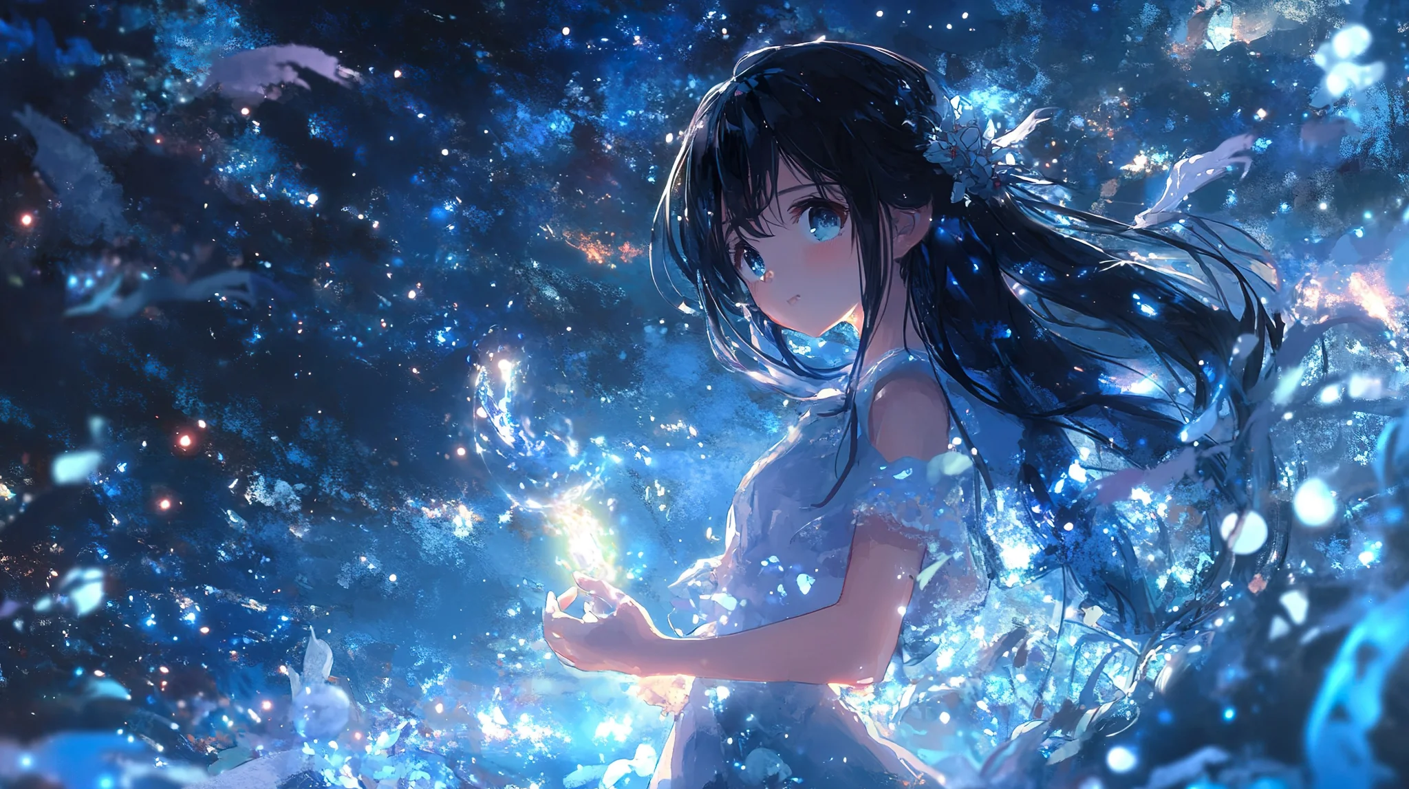 Categories Anime Wallpapers Tags 4K, anime, celestial, cosmic, ethereal, fantasy, girl, glowing star, long hair, night sky