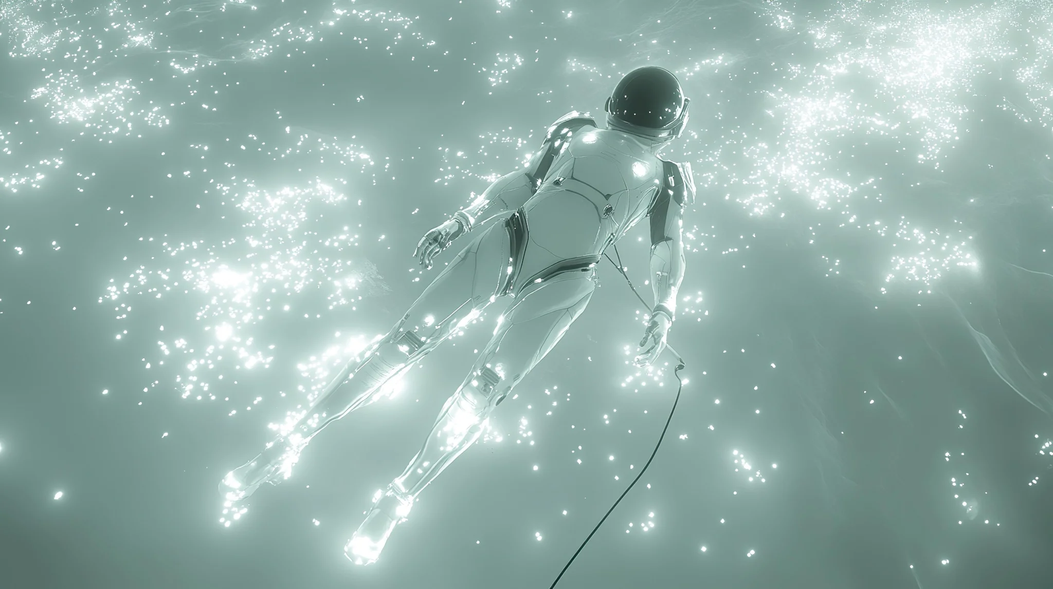 Ethereal Astronaut Drifting In Cosmic Light Wallpaper A lone astronaut in a sleek suit floats amidst a sea of glowing particles, creating a mesmerizing space background.Download ▼
