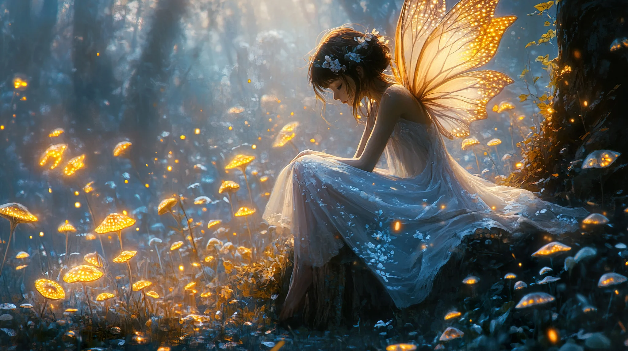 Ethereal Fairy In A Mystical Forest Wallpaper A captivating fairy with glowing wings sits amidst luminescent mushrooms, creating a magical forest background.Download ▼ Related Wallpapers