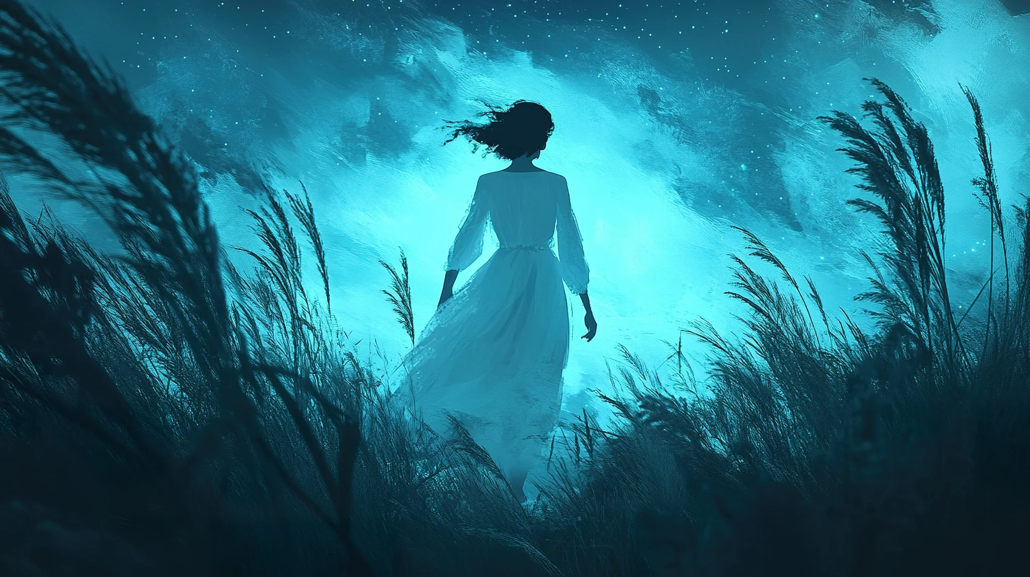 A captivating scene of a girl in a white dress walking through a moonlit field, perfect for a serene and dreamy background.