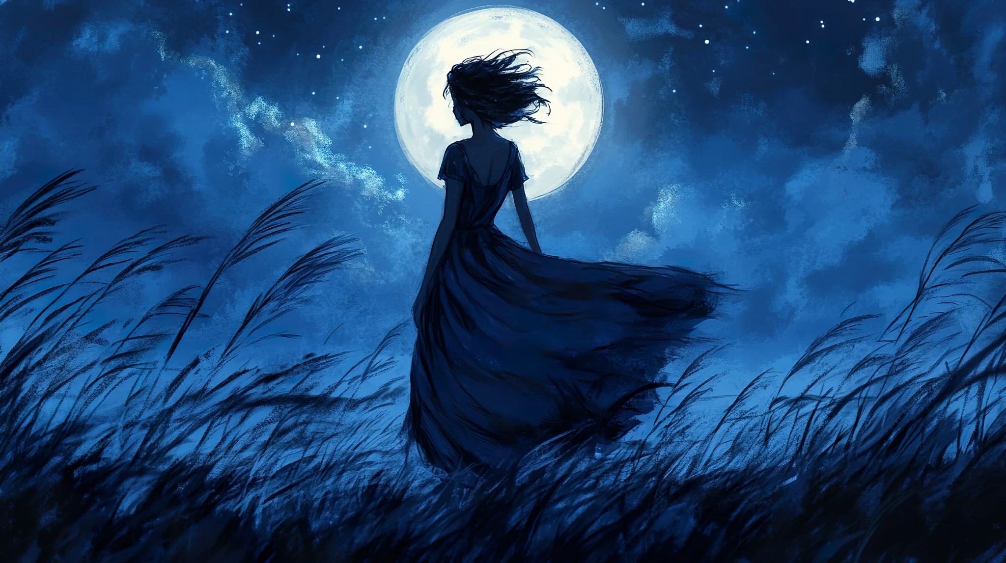 Ethereal Night Stroll Under A Full Moon Wallpaper A captivating scene of a girl in a flowing dress, silhouetted against a luminous full moon, perfect for a serene background.Download ▼ Related Wallpapers