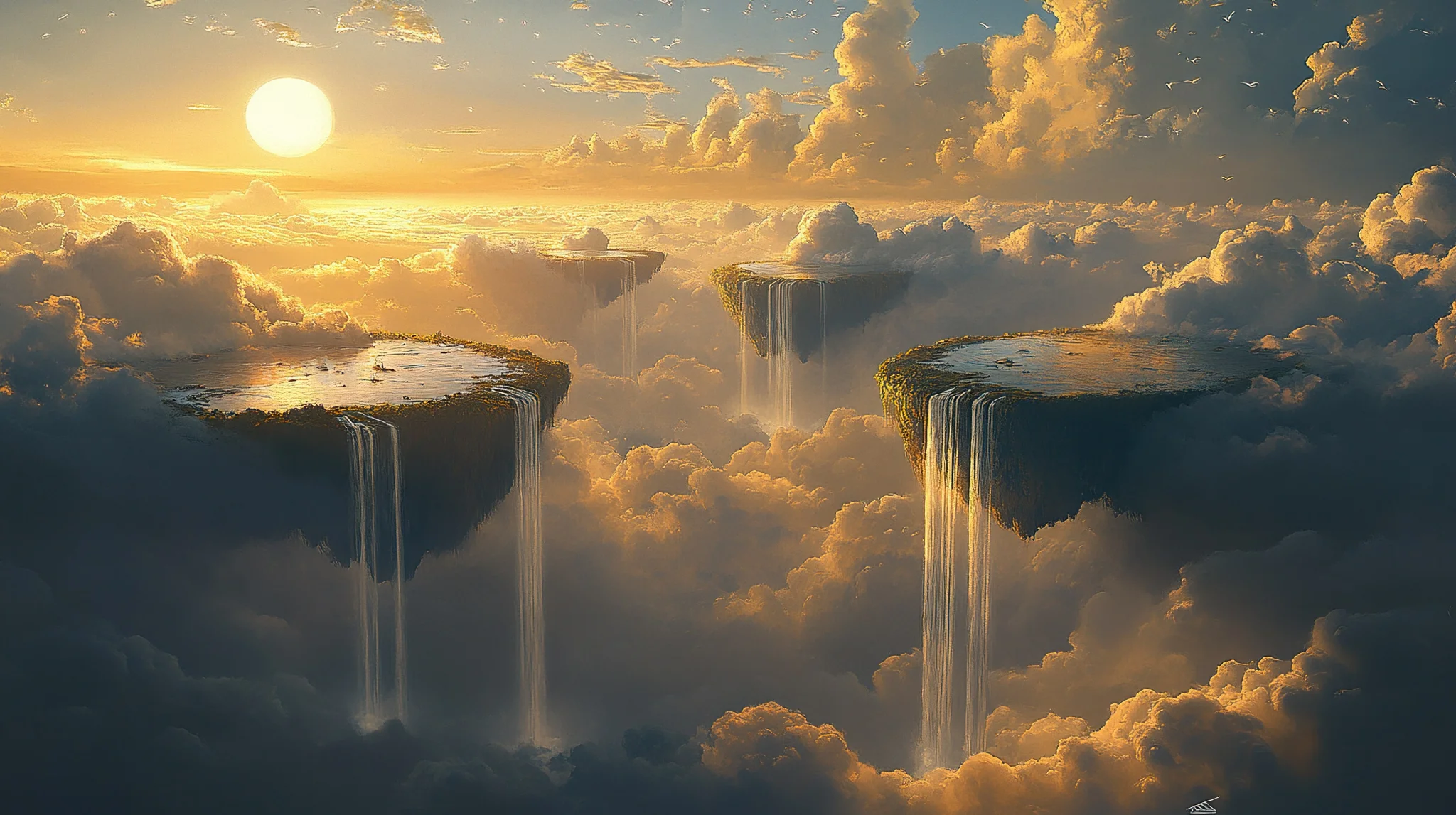 Floating Islands In The Sky At Sunset Wallpaper Experience the serene beauty of floating islands amidst clouds at sunset, perfect for a captivating background.Download ▼ Related Wallpapers