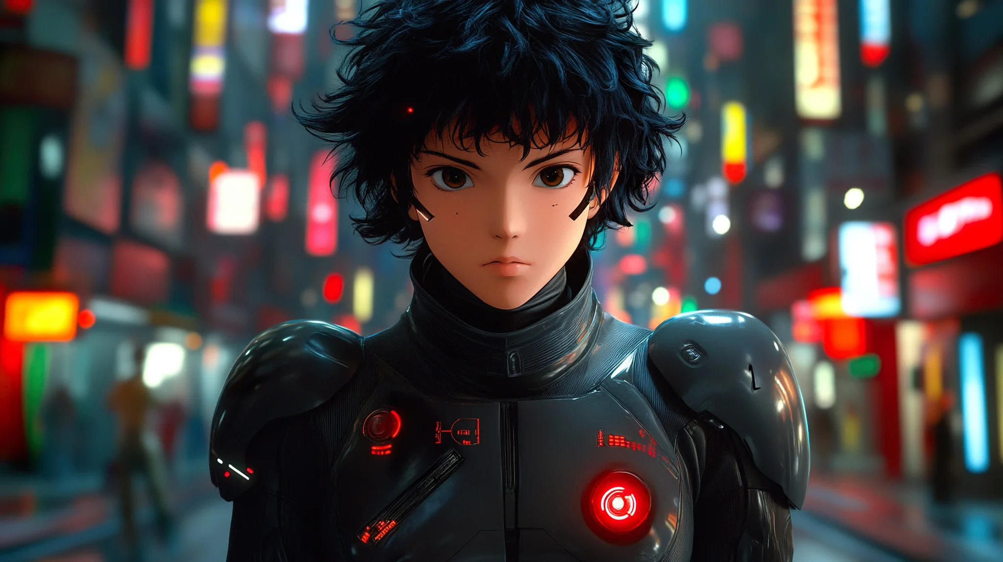 Explore a captivating anime character in a futuristic suit amidst a vibrant neon-lit cityscape, perfect for a dynamic background.