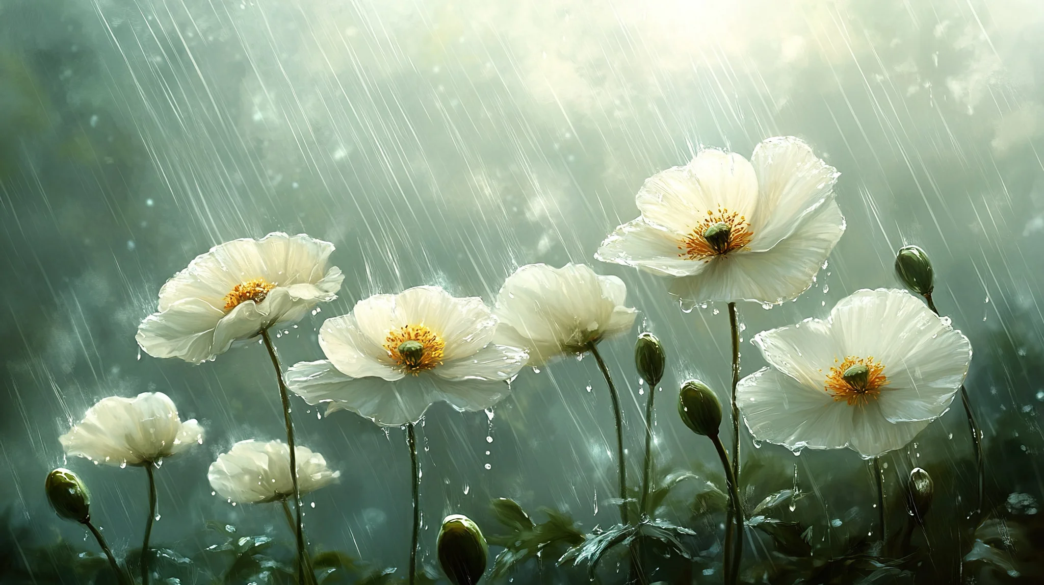 Gentle Rain On White Poppies Wallpaper Experience tranquility with this soft painting of white poppies under gentle rain, perfect for a serene background.Download ▼ Related Wallpapers