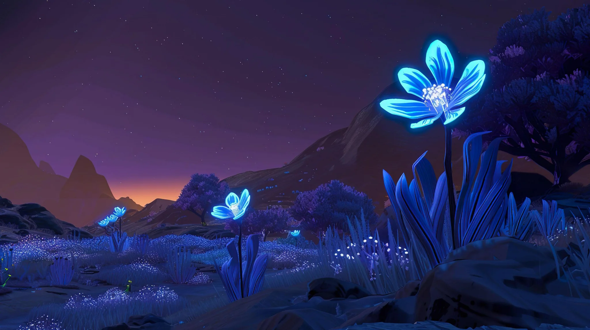 Download this stunning wallpaper featuring glowing alien flora against a mystical night landscape, perfect for a unique background.