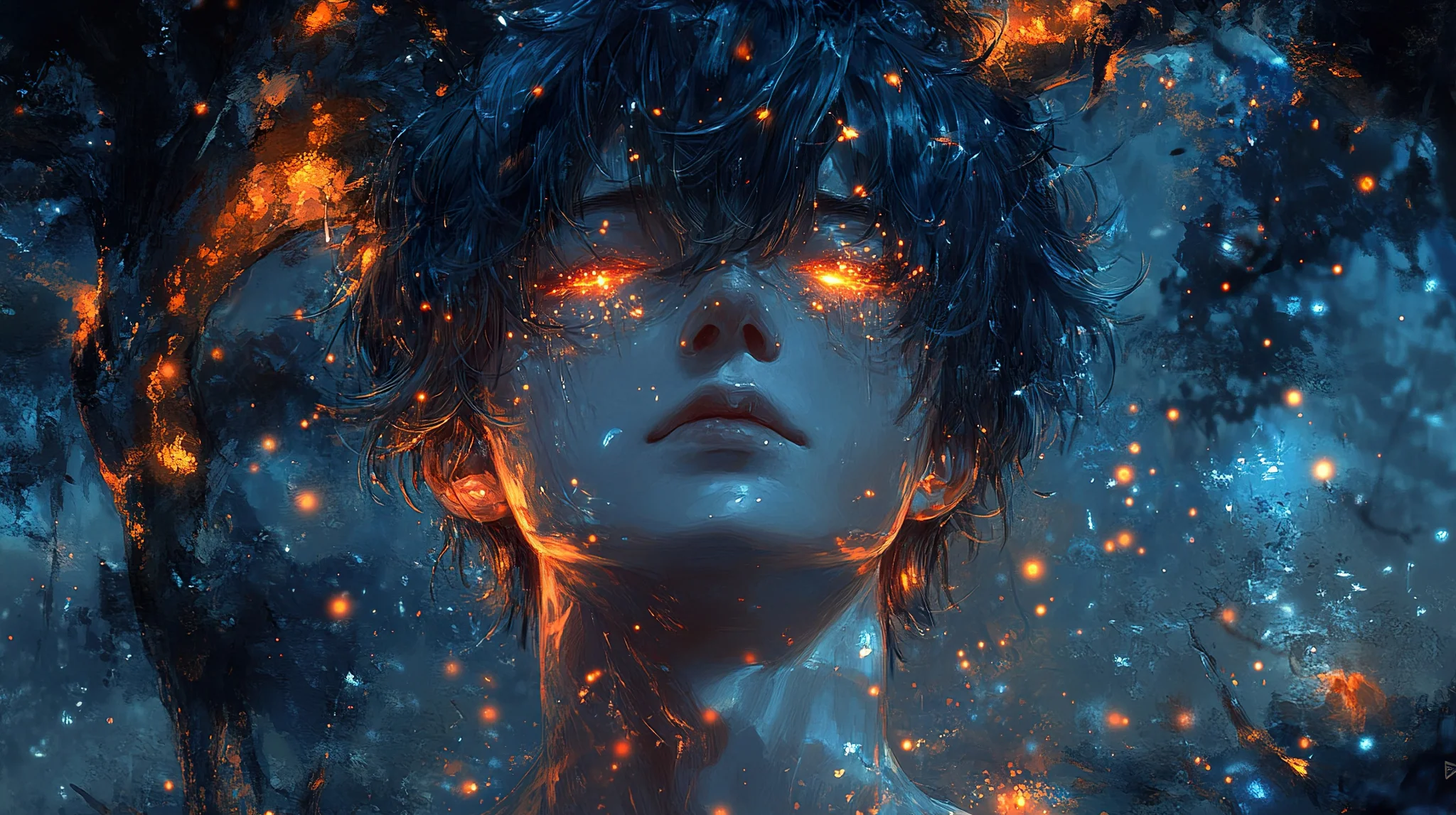 Mystical Anime Character Amidst Glowing Fireflies Wallpaper A captivating anime character surrounded by luminous fireflies, creating a magical night scene perfect for your desktop background.Download ▼