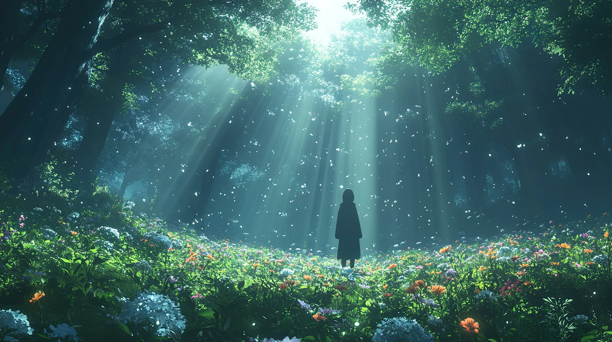 Mystical Forest Journey With Anime Character Wallpaper A serene anime character stands in a glowing forest, surrounded by vibrant flowers and ethereal light, perfect for a captivating background.Download ▼