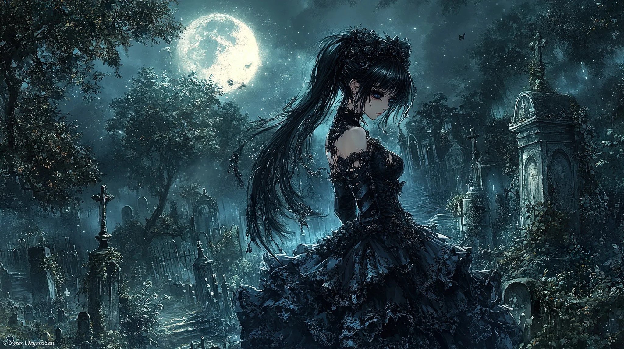 Mystical Gothic Lolita In Moonlit Cemetery Wallpaper Immerse in a hauntingly beautiful scene with a Gothic Lolita under a full moon, perfect for a captivating background.Download ▼