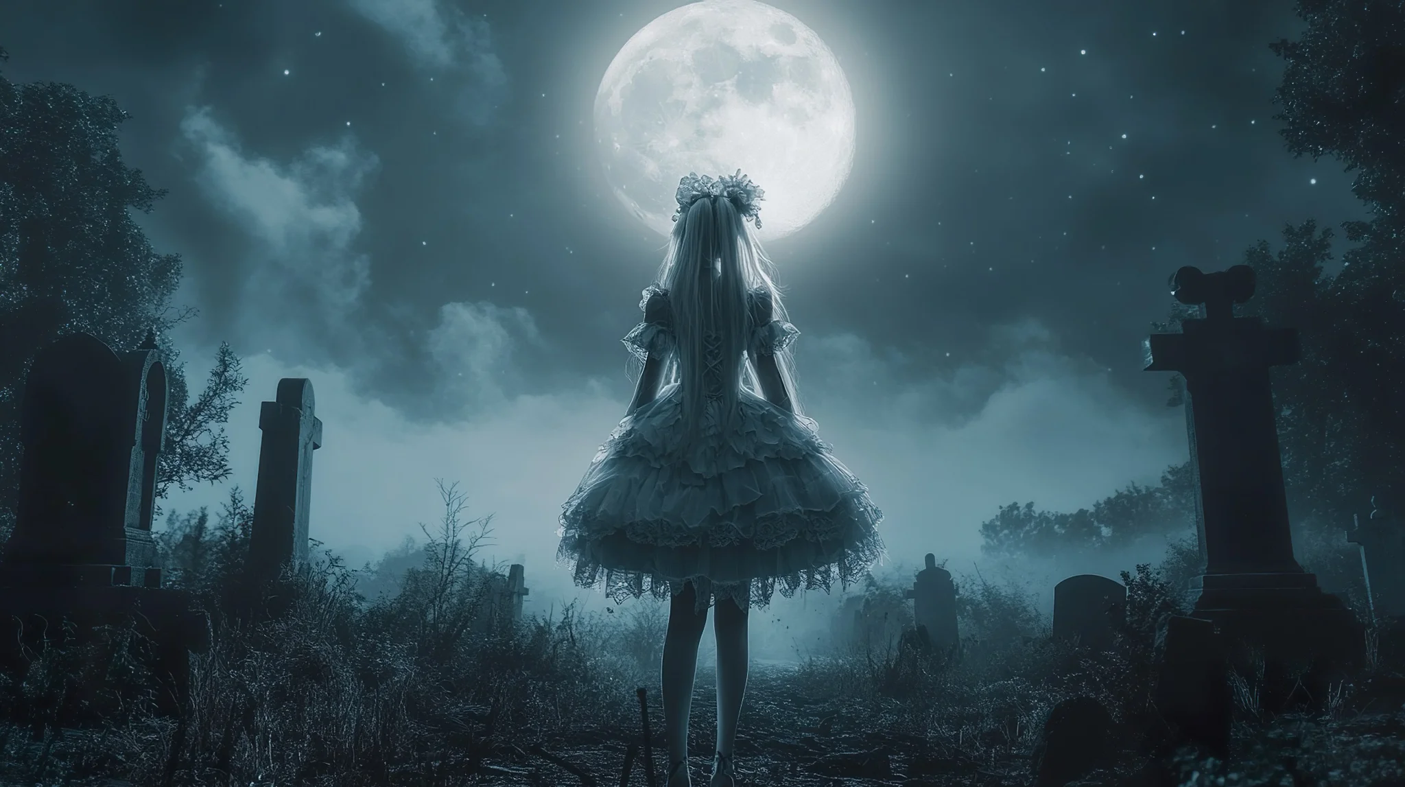 Mystical Moonlit Night With Gothic Lolita Wallpaper A captivating scene of a Gothic Lolita girl under a full moon, perfect for a dramatic and enchanting background.Download ▼