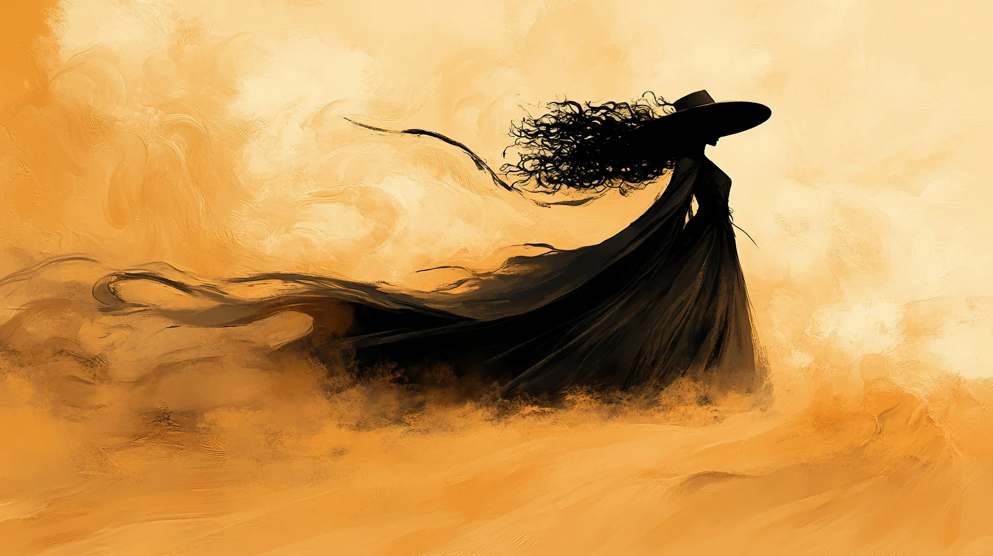 Silhouette of a girl with dark curly hair and a wide-brimmed hat in a desert scene.