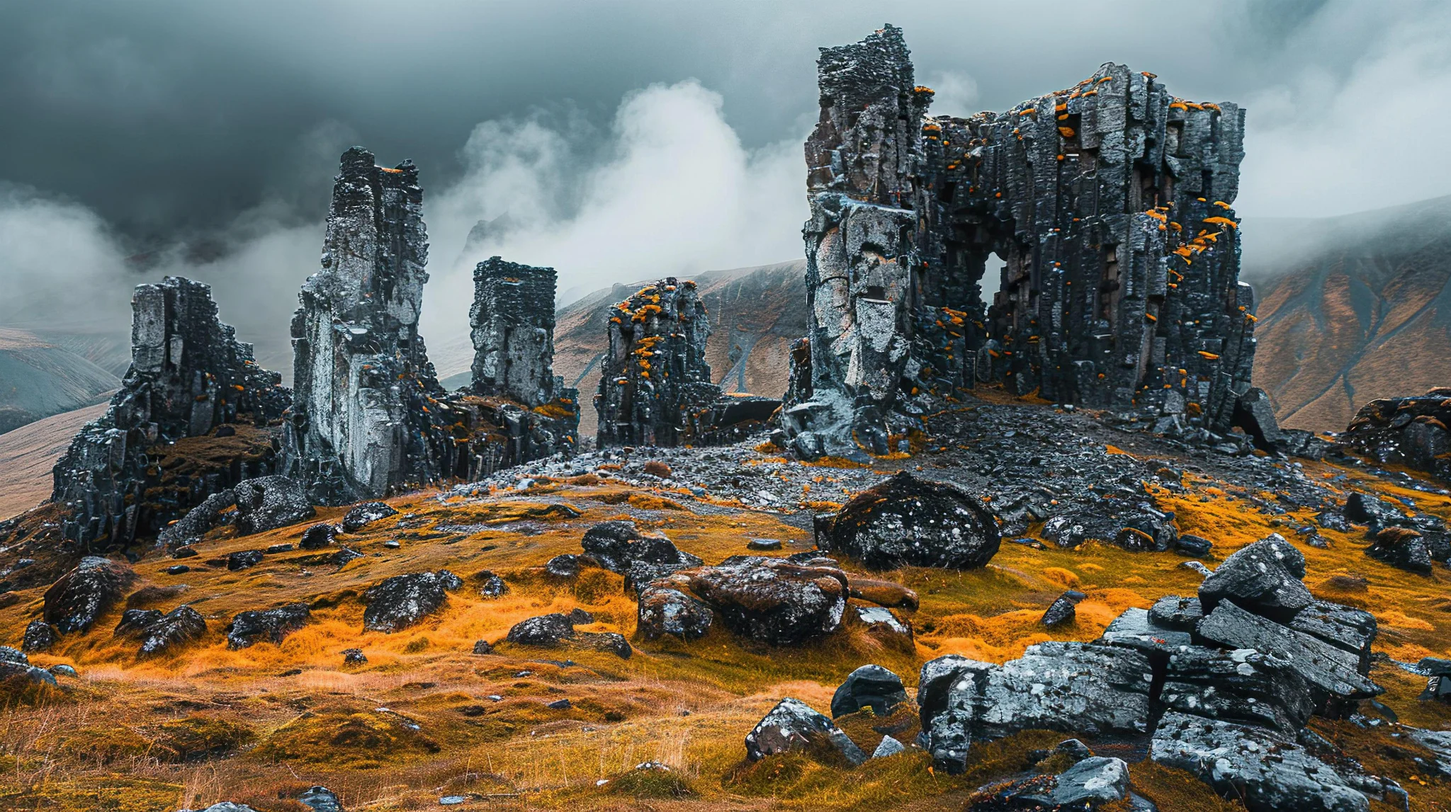 Explore the scattered ruins of an ancient civilization with this stunning landscape wallpaper, perfect for adding a touch of mystery to your screen.