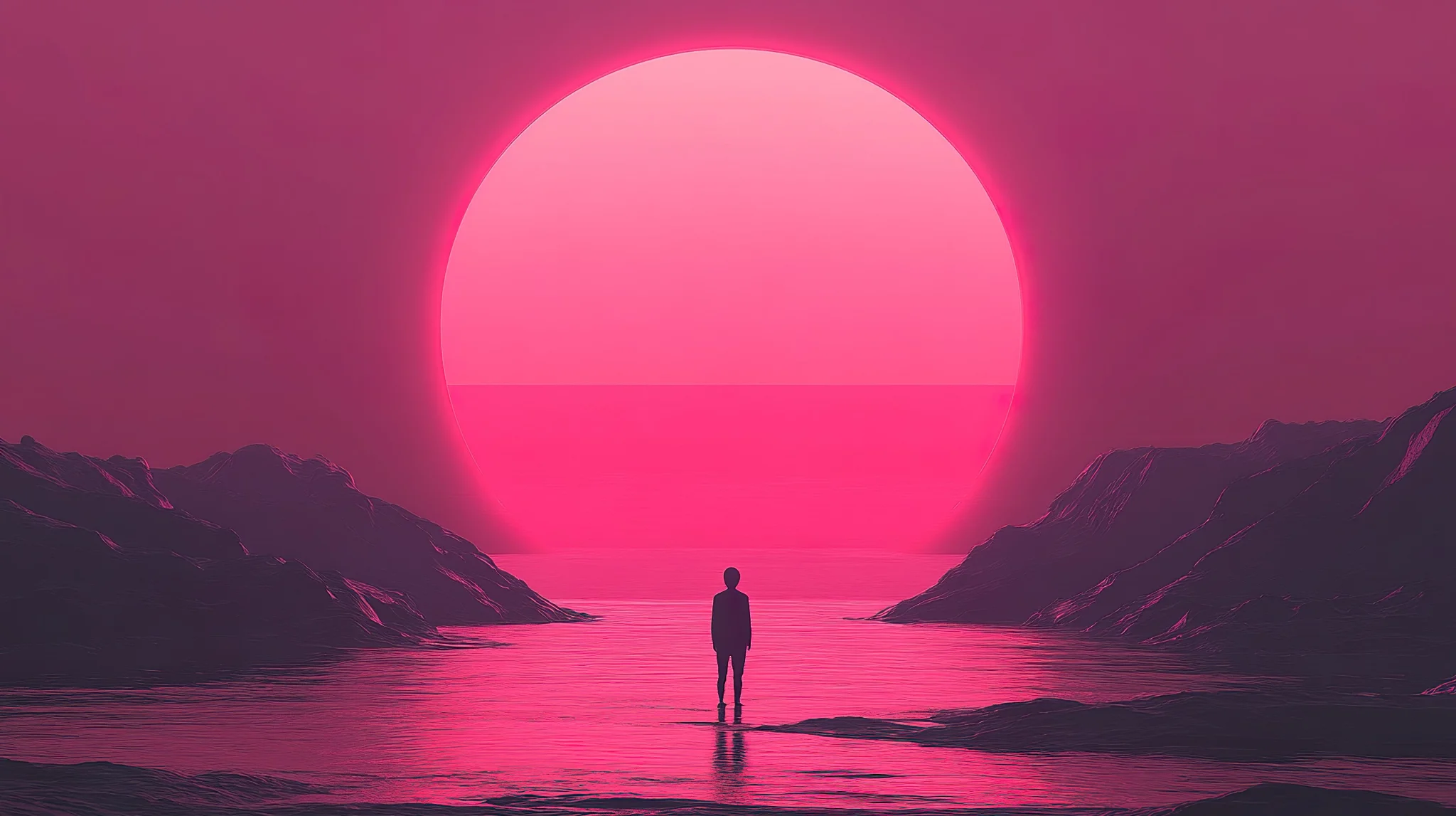 Serene Anime Sunset Over Ocean With Lone Silhouette Wallpaper Experience tranquility with this anime-inspired sunset over the ocean, featuring a lone silhouette. Perfect for a calming background.Download ▼