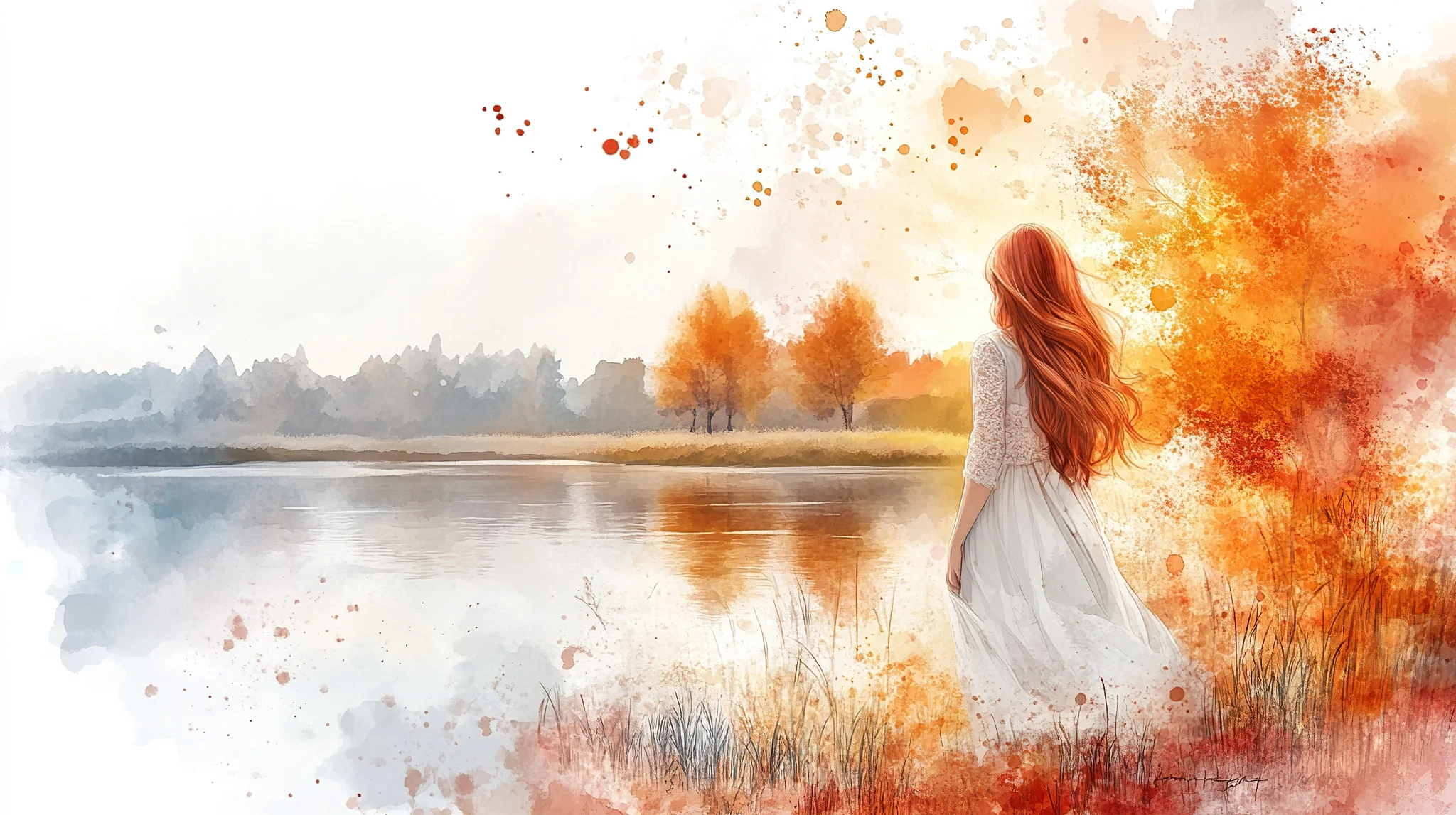 A captivating illustration of a girl with flowing hair by a tranquil lake, surrounded by autumn hues. Perfect for a calming background.