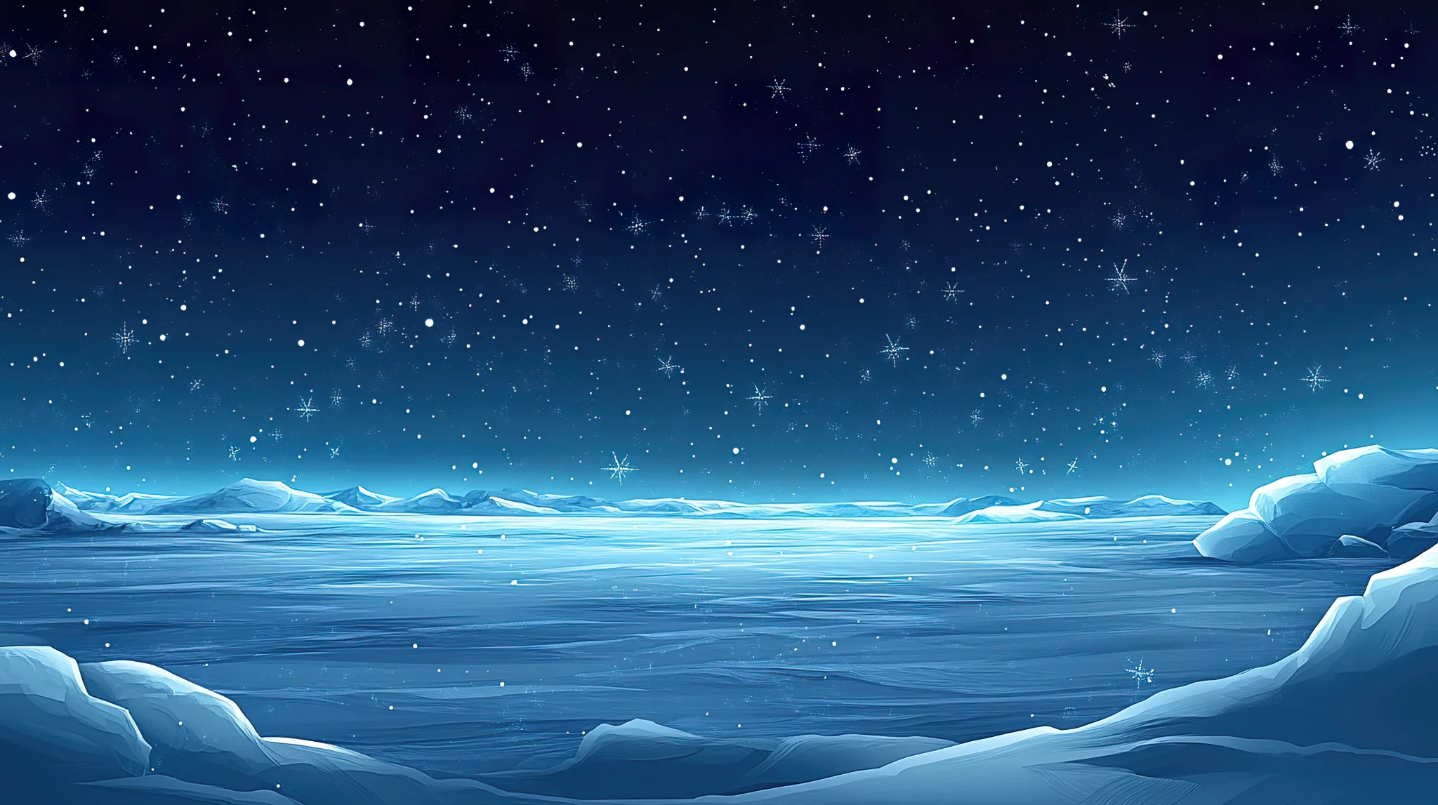 Illustration of a frozen lake under a starry night sky with distant mountains.