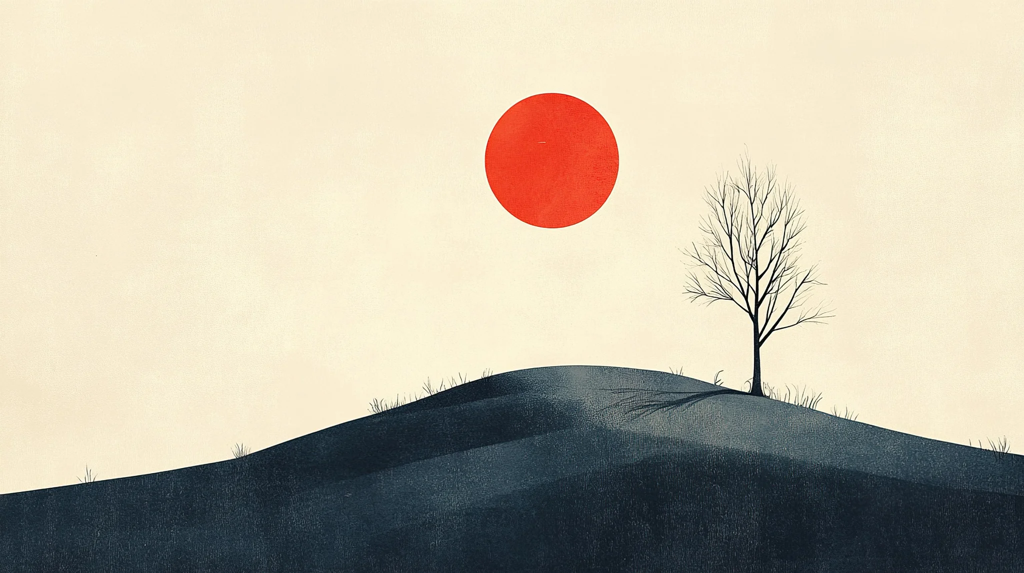 Serene Hill And Tree With Red Sun Background A minimalist illustration of a lone tree on a hill under a striking red sun, creating a tranquil background.Download ▼ Related Wallpapers