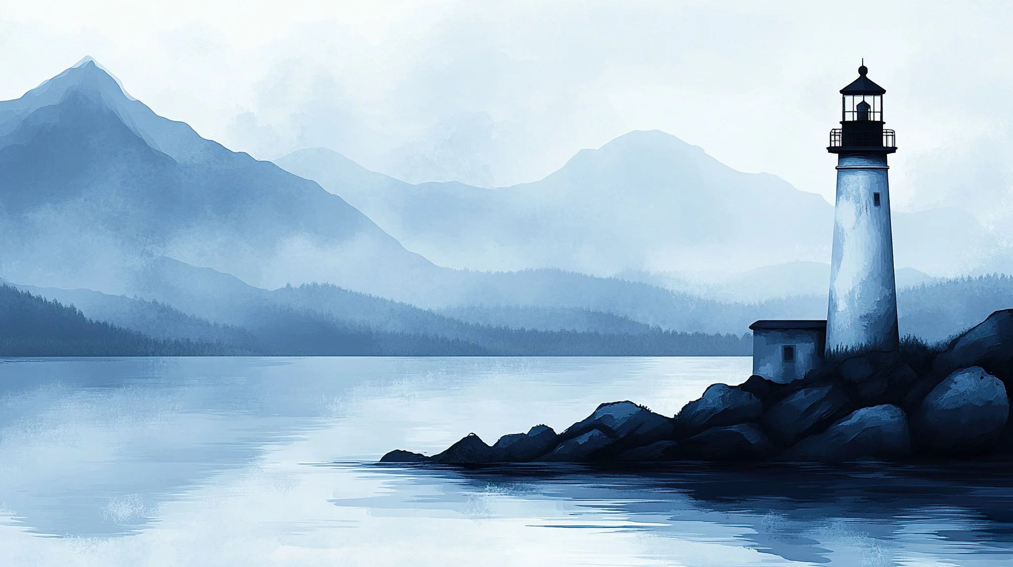 Illustration of a solitary lighthouse on a rocky shore with misty mountains in the background.