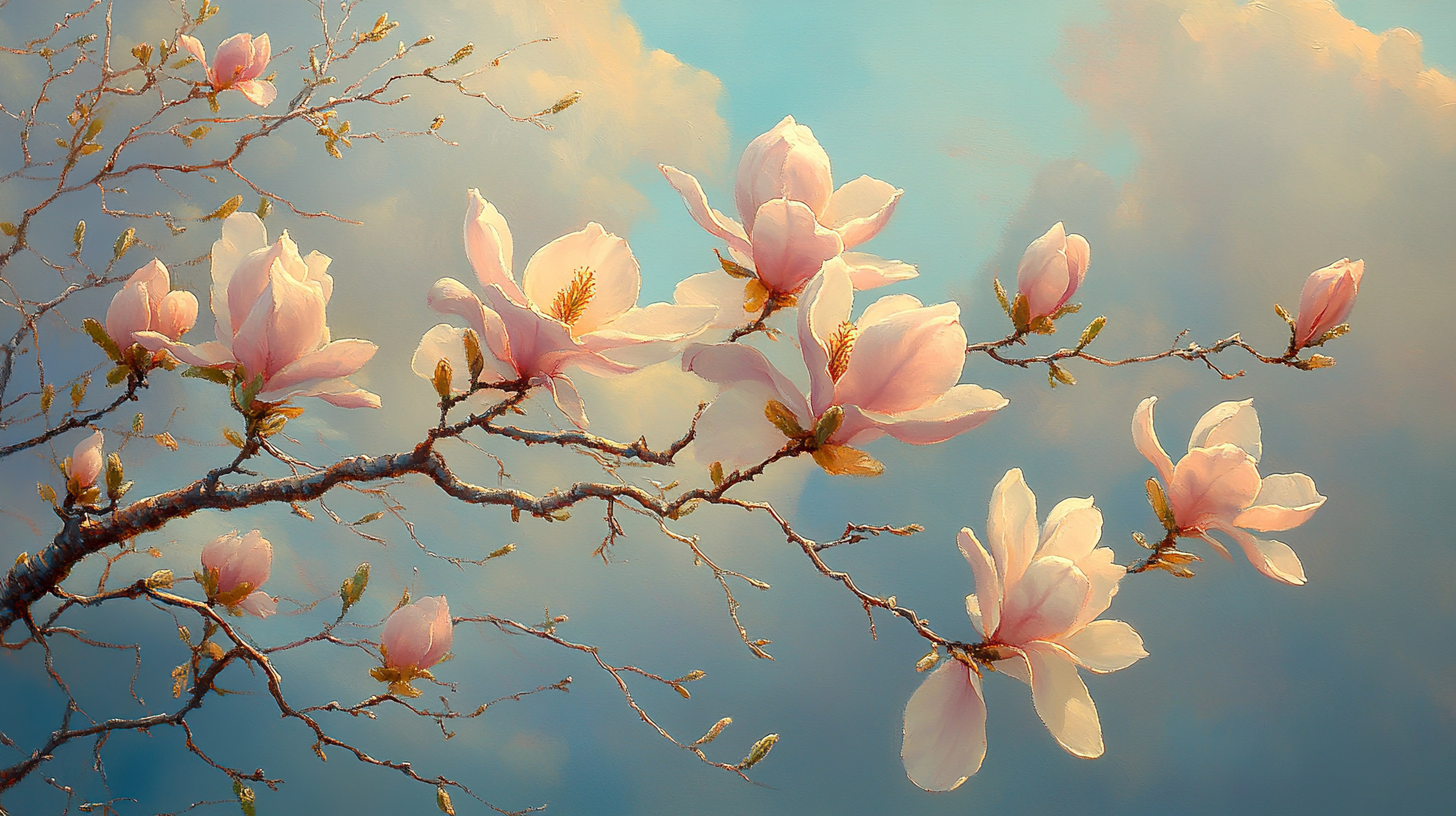 Serene Magnolia Blossoms Against A Soft Sky Wallpaper Delicate magnolia blossoms on twisting branches set against a tranquil sky, perfect for a calming background. Download ▼ Related Wallpapers