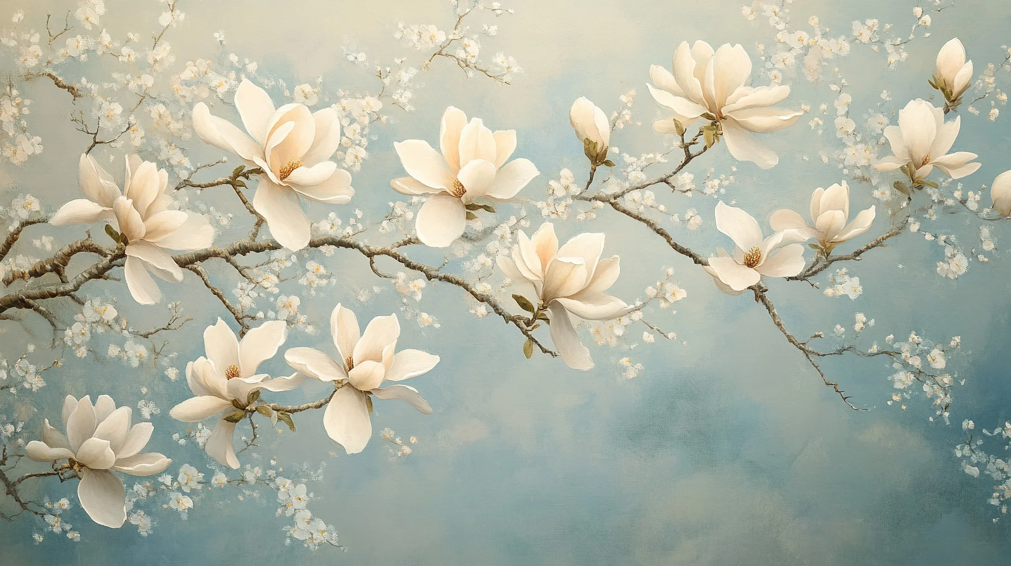 Serene Magnolia Blossoms On A Gentle Breeze Wallpaper Experience tranquility with this airy painting of magnolia blossoms, perfect for a calming background.Download ▼ Related Wallpapers