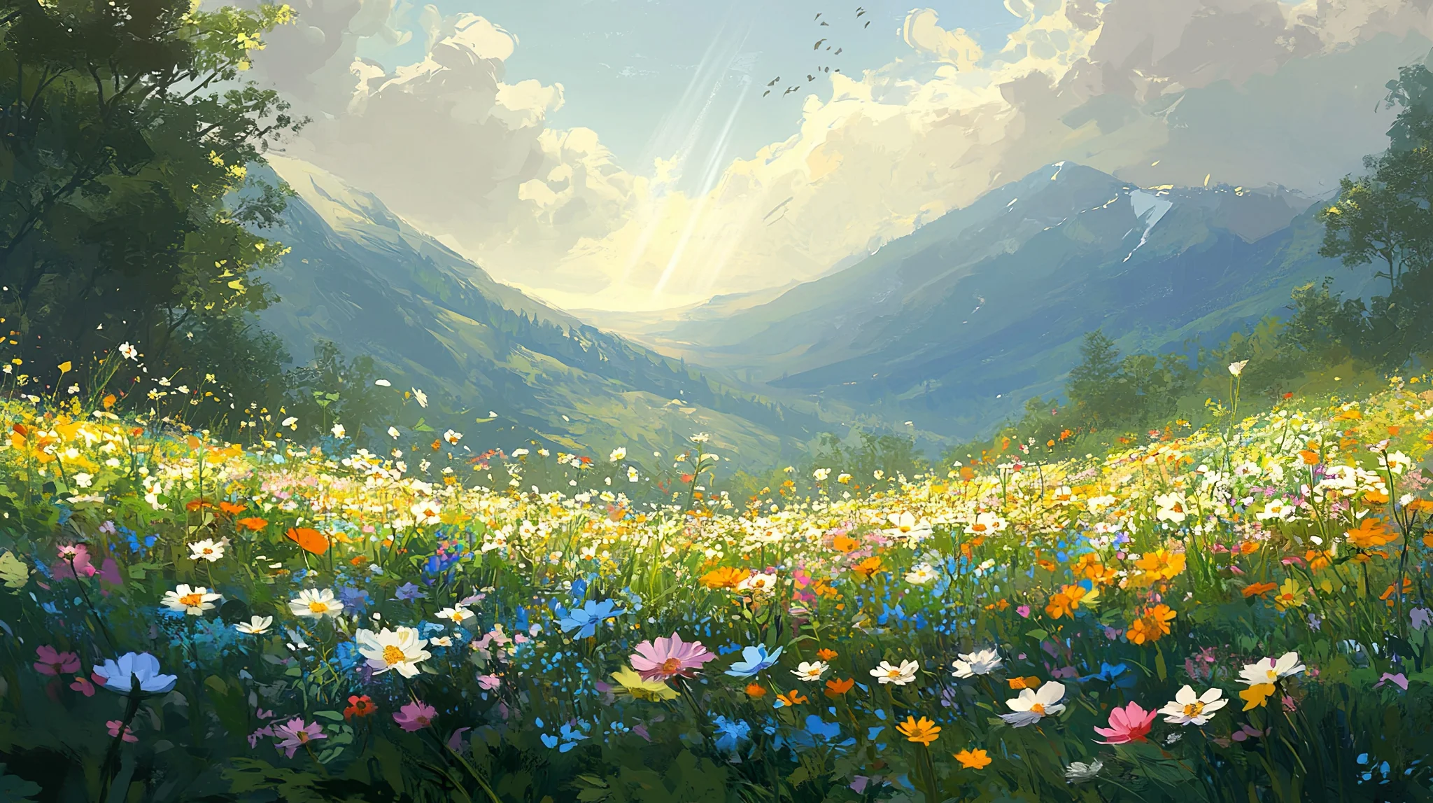 Immerse yourself in a tranquil meadow filled with vibrant wildflowers, set against majestic mountains. Perfect for a refreshing background.