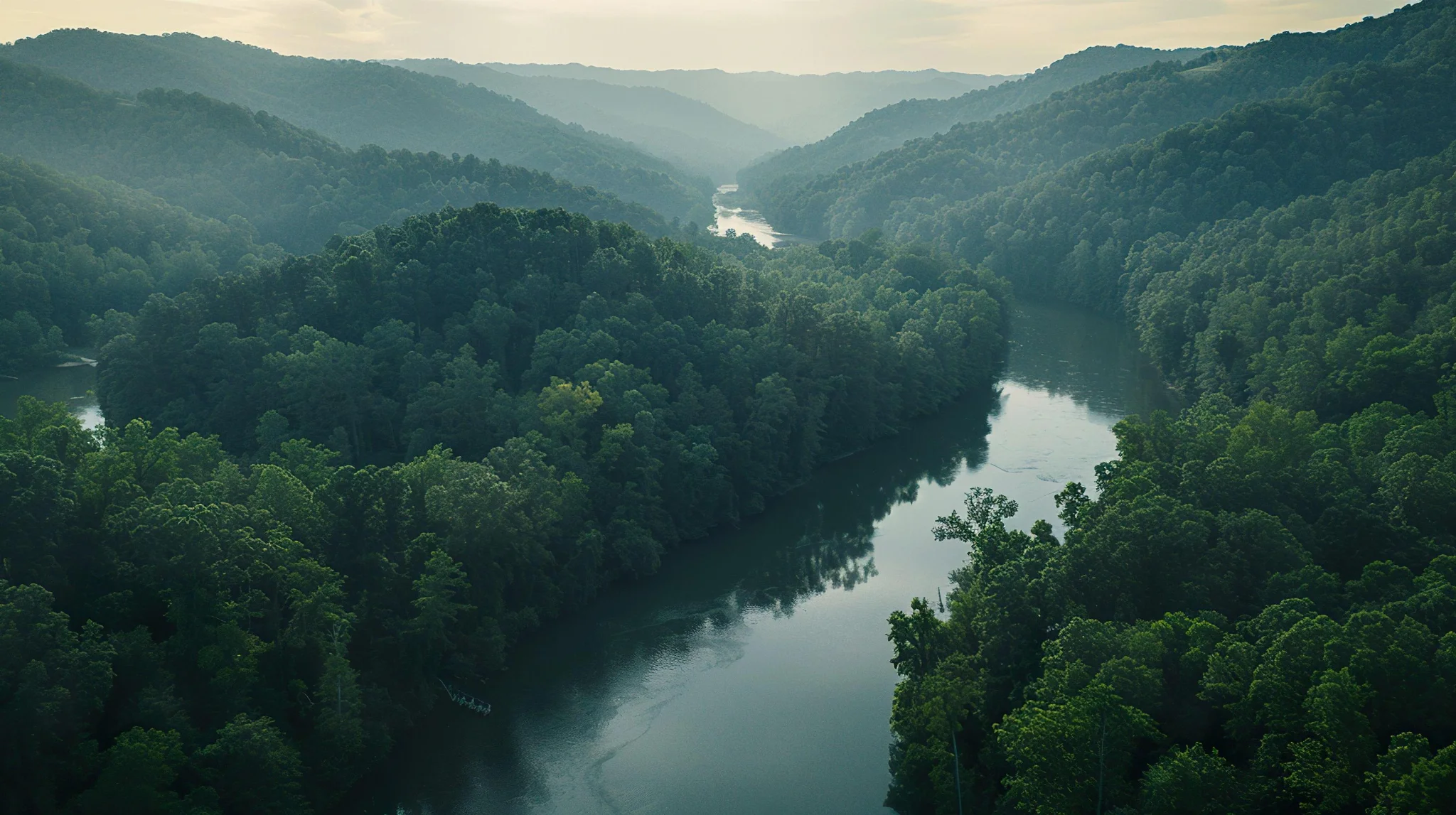 Download this stunning wallpaper featuring a winding river cutting through a dense forest, perfect for nature lovers seeking tranquility.