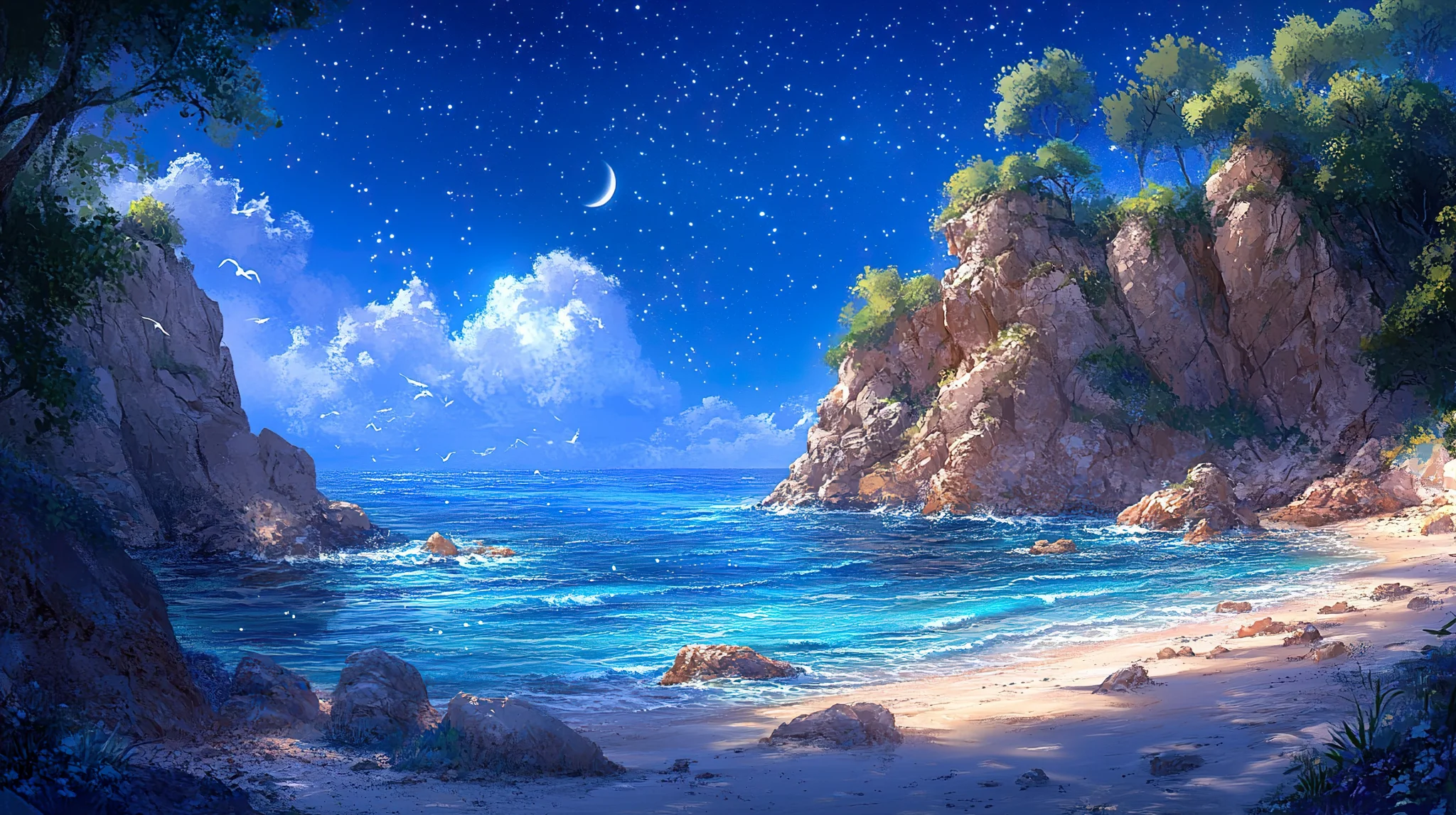 Experience tranquility with this stunning illustration of a rocky cliff by a calm ocean under a starry sky, perfect for your desktop background.