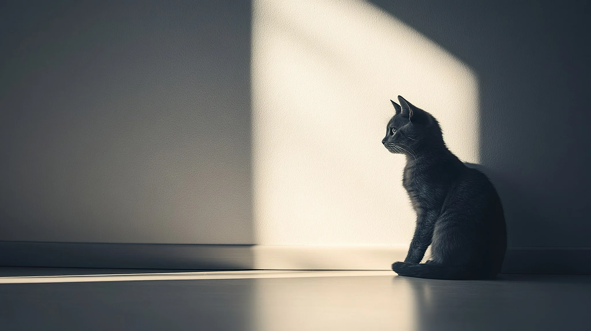A sleek black cat sits quietly in a sunlit room, casting a serene silhouette. Perfect for a calming background.