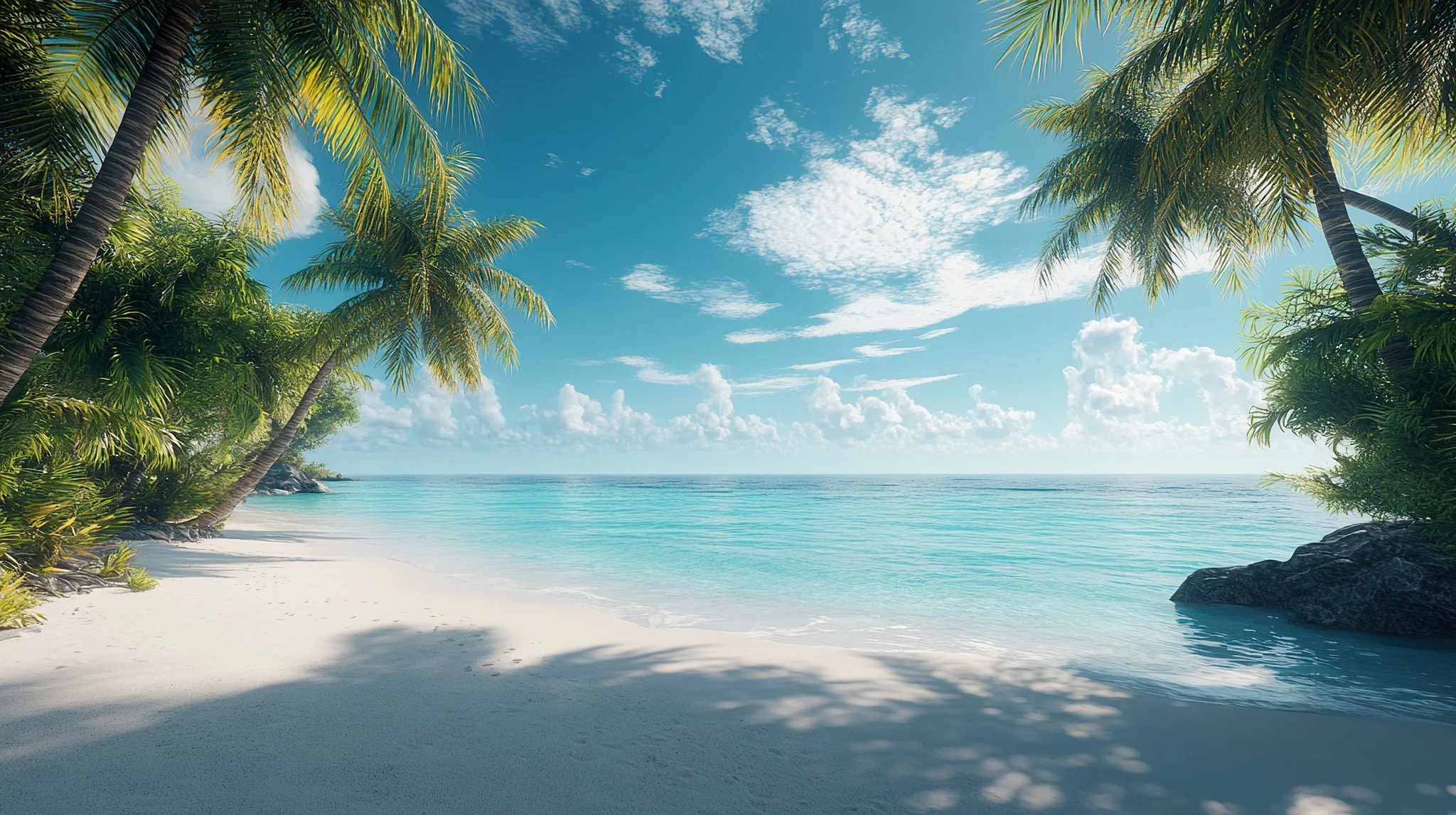 Serene Tropical Beach Scene With Palm Trees Wallpaper Minimalist tropical beach background, featuring powder-white sand and lush palm trees under a clear sky.Download ▼