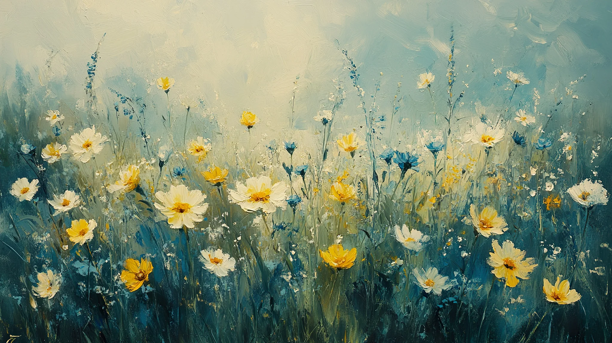 Serene Wildflower Meadow In Soft Hues Wallpaper Immerse in a tranquil scene of wildflowers in gentle yellows and blues, perfect for a calming background.Download ▼ Related Wallpapers