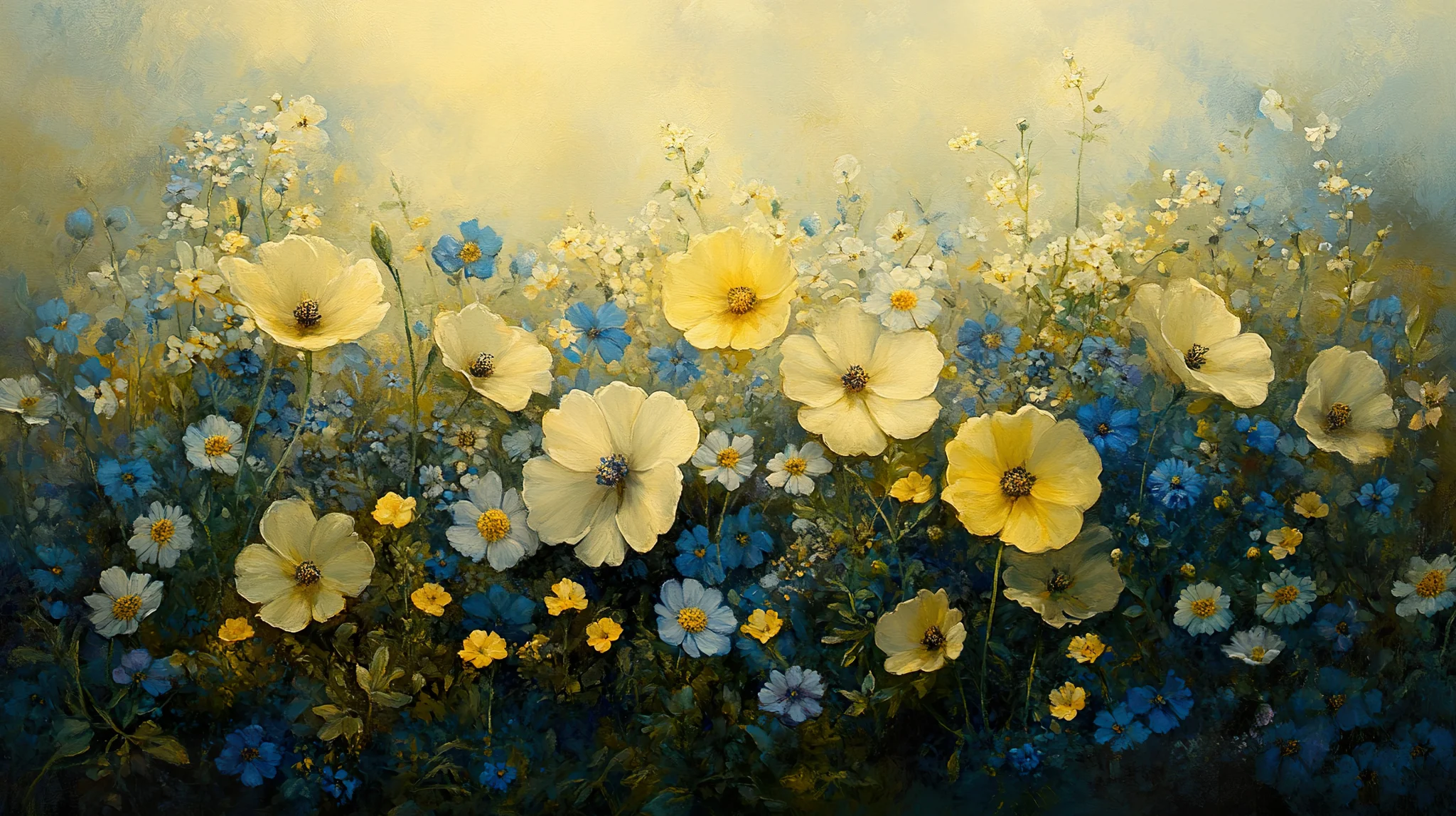 Serene Wildflower Meadow In Soft Yellow And Blue Background A tranquil scene of assorted wildflowers in pale yellow and blue hues, creating a soothing and picturesque background.Download ▼ Related Wallpapers