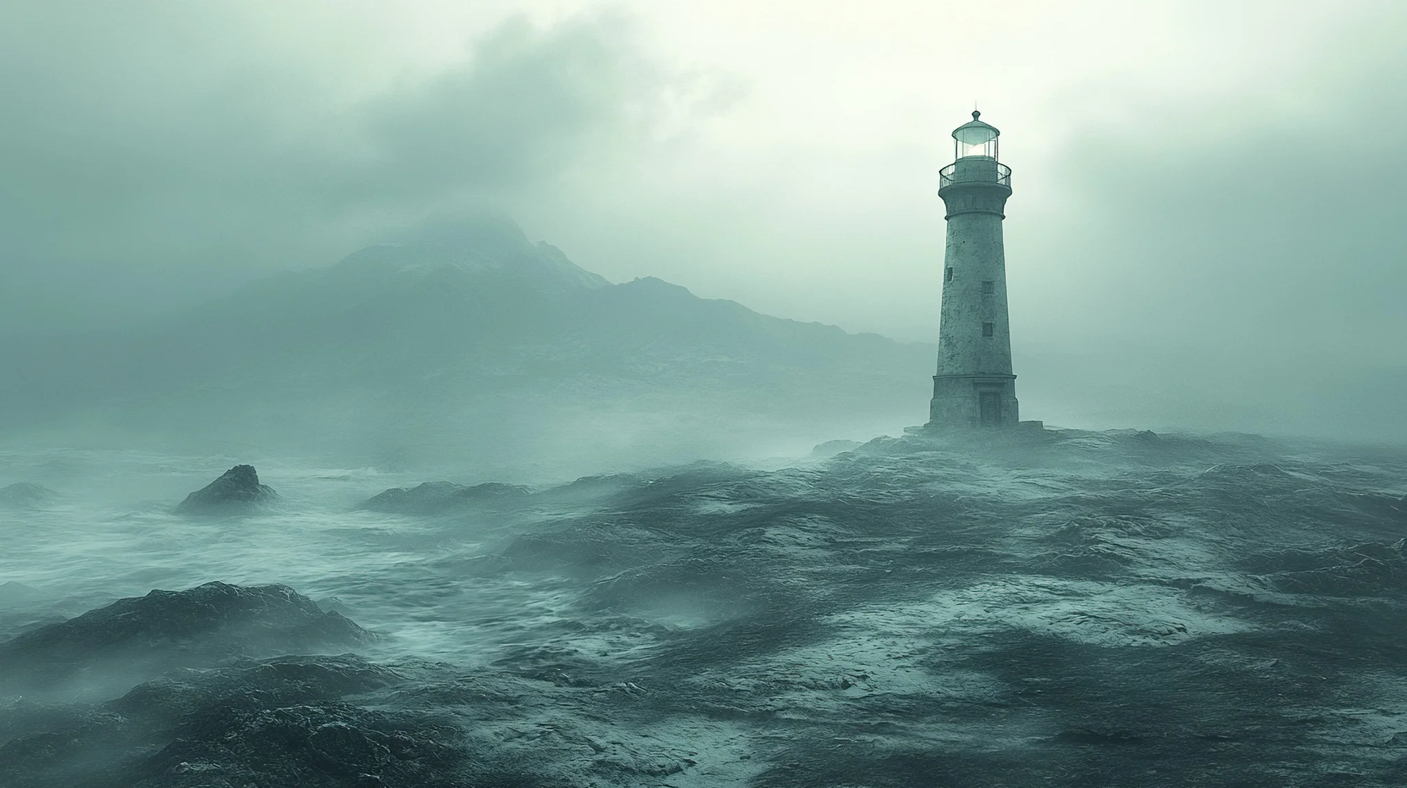 A solitary lighthouse on a rocky shore surrounded by misty waters.