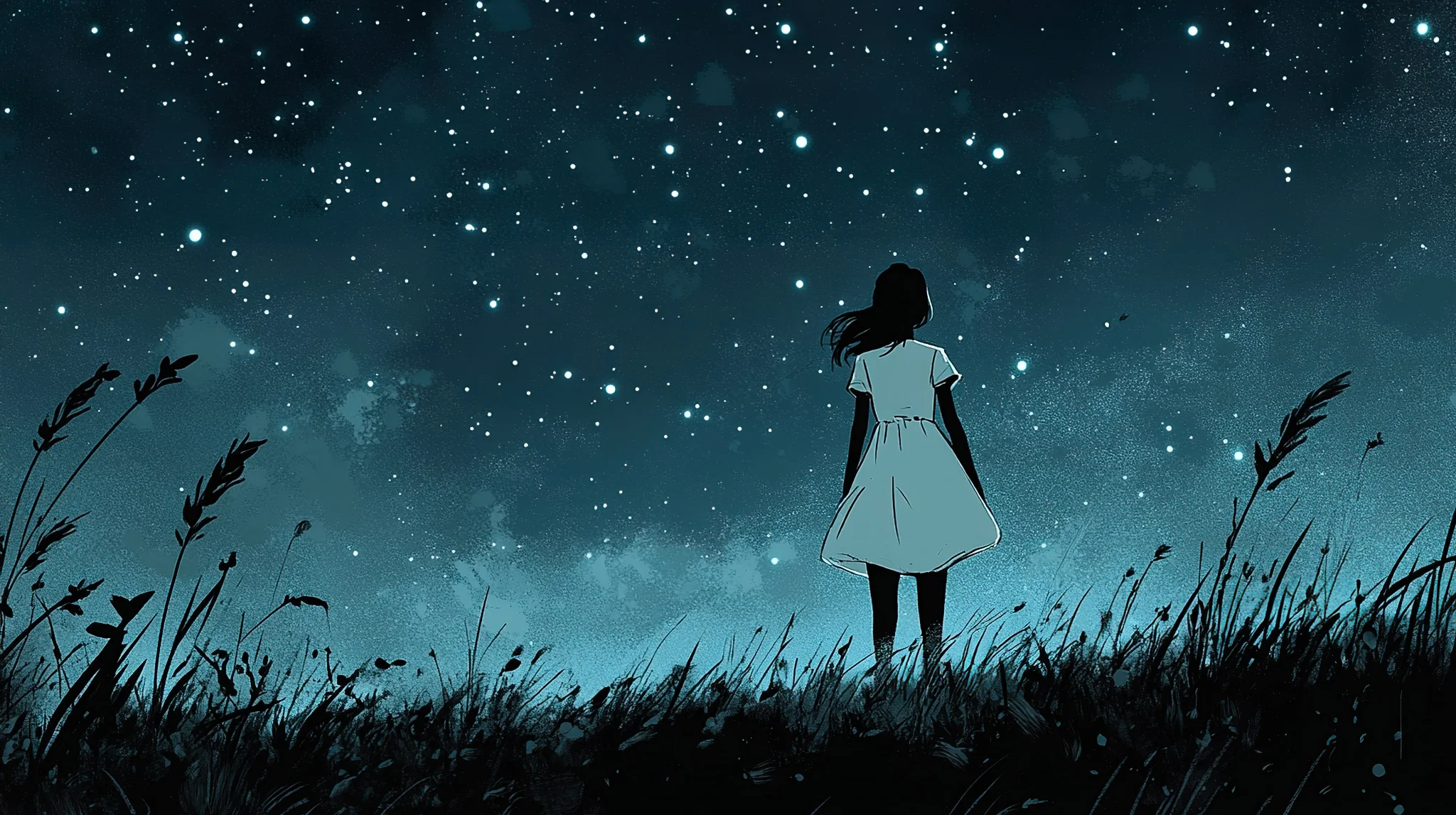 Silhouette of a girl in a white dress standing in a field under a starry sky.