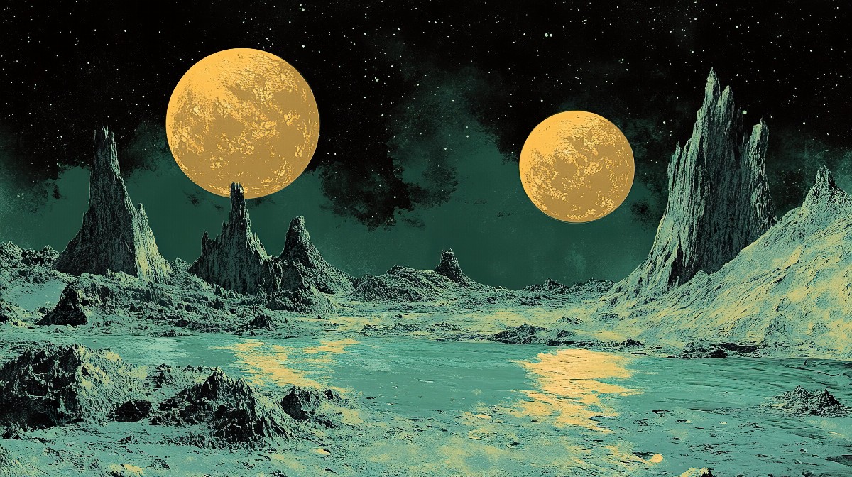 Explore a surreal rocky landscape under twin moons, perfect for a captivating background.