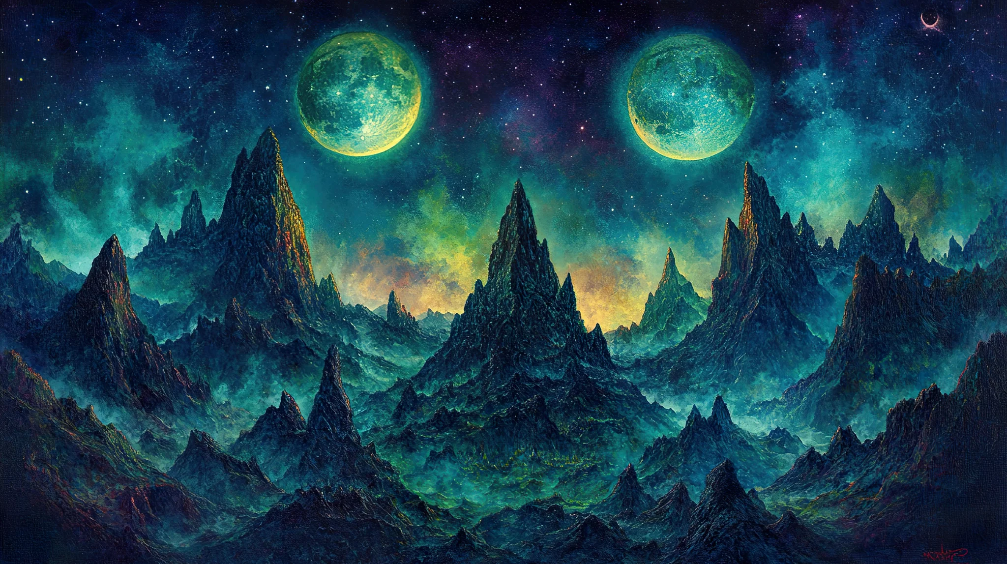 A surreal landscape with two moons over rocky peaks in deep blues and greens.