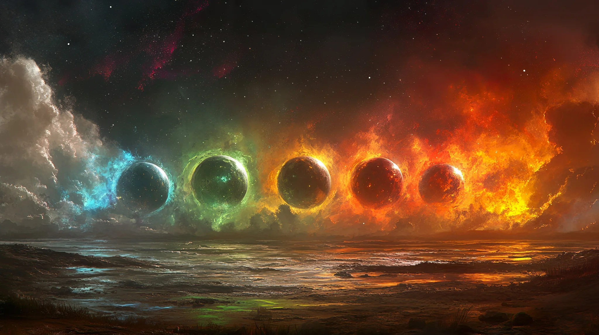 Vibrant Cosmic Alignment A Celestial Fantasy Wallpaper Explore a mesmerizing lineup of colorful planets set against a cosmic backdrop, perfect for a captivating fantasy background.Download ▼ Related Wallpapers