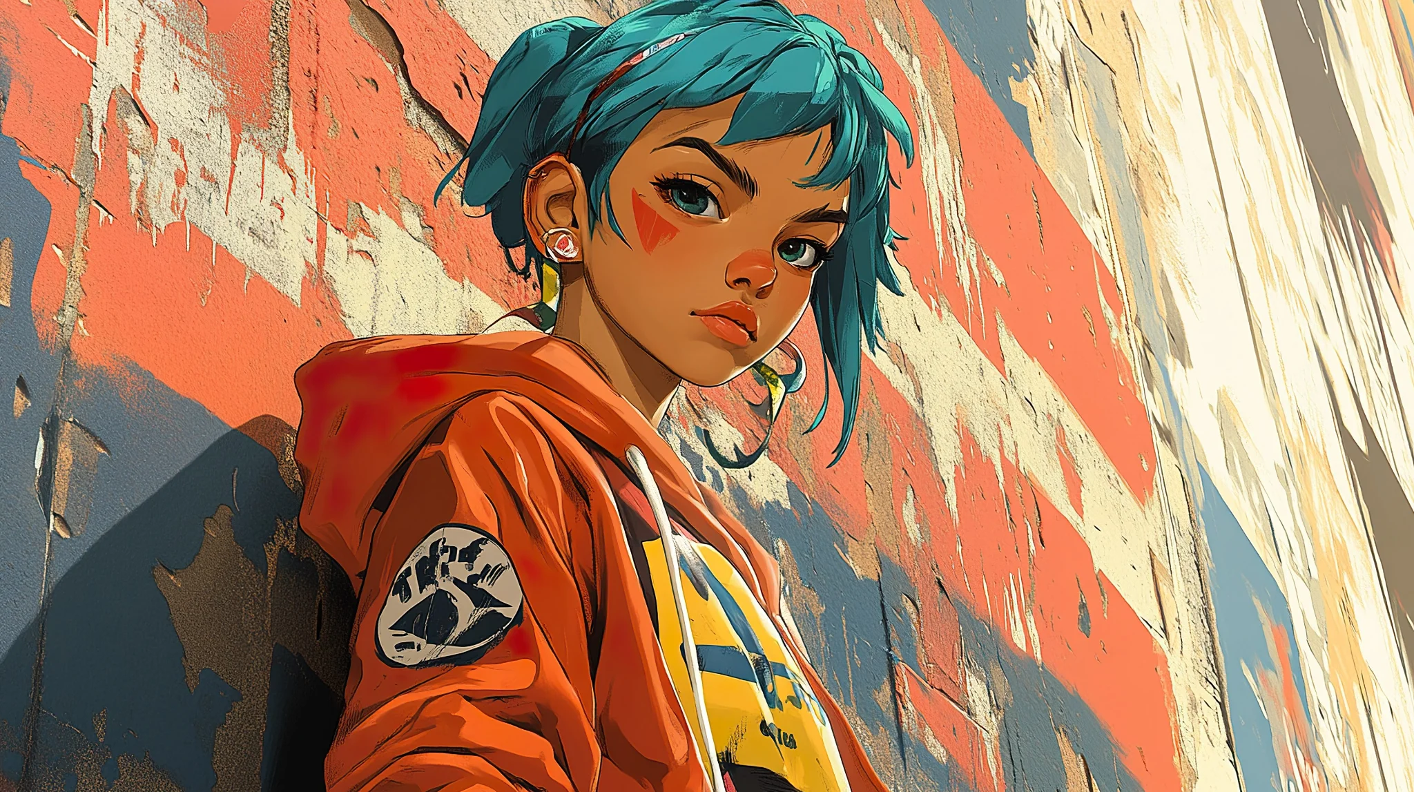 Vibrant Teal Pixie Cut Girl Against Urban Wall Wallpaper A striking illustration of a girl with a teal pixie cut, set against a textured urban wall, perfect for a dynamic background.Download ▼ Related Wallpapers