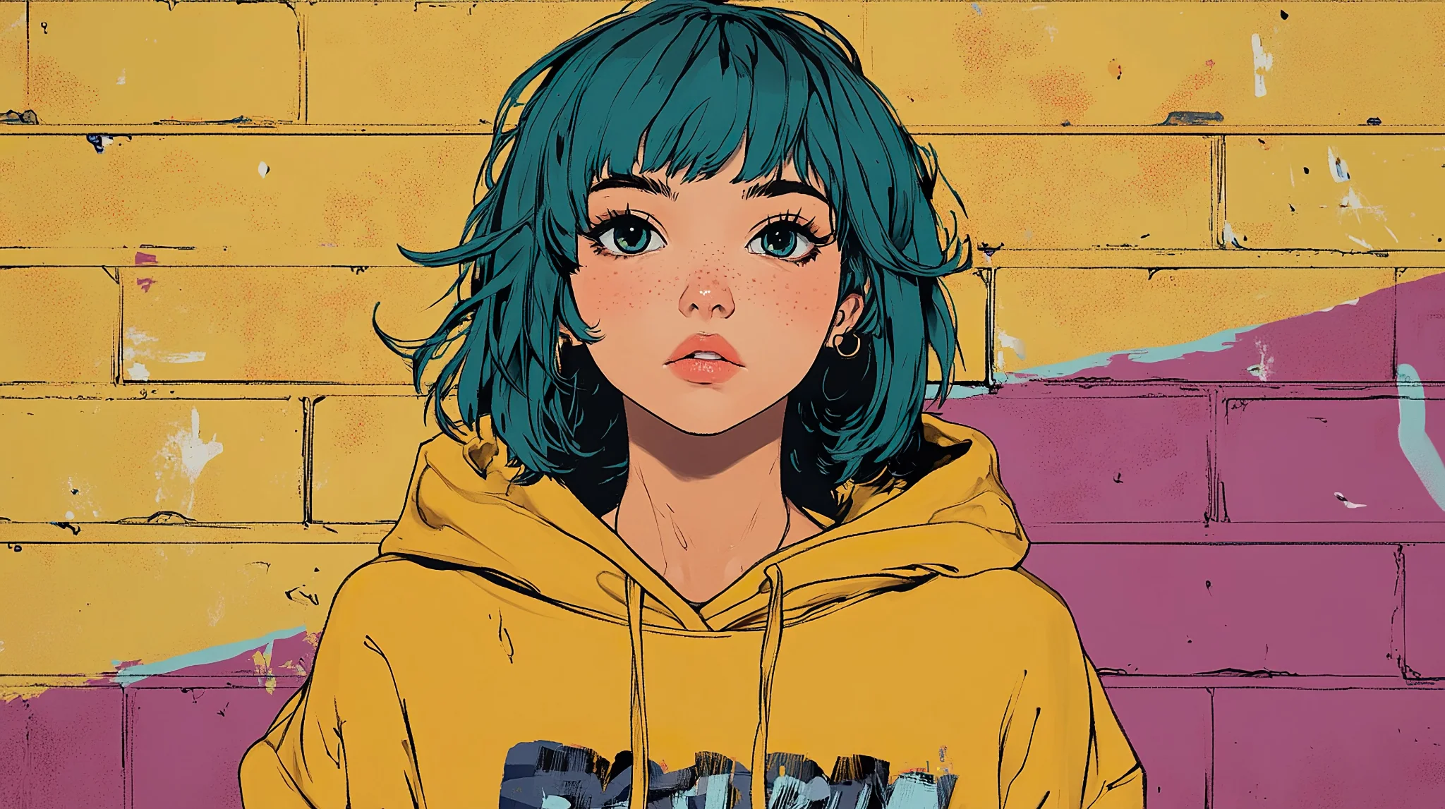 Vibrant Teal Pixie Cut Girl Illustration Background A captivating illustration of a girl with a vibrant teal pixie cut against a colorful wall, perfect for a unique and artistic background.Download ▼ Related Wallpapers
